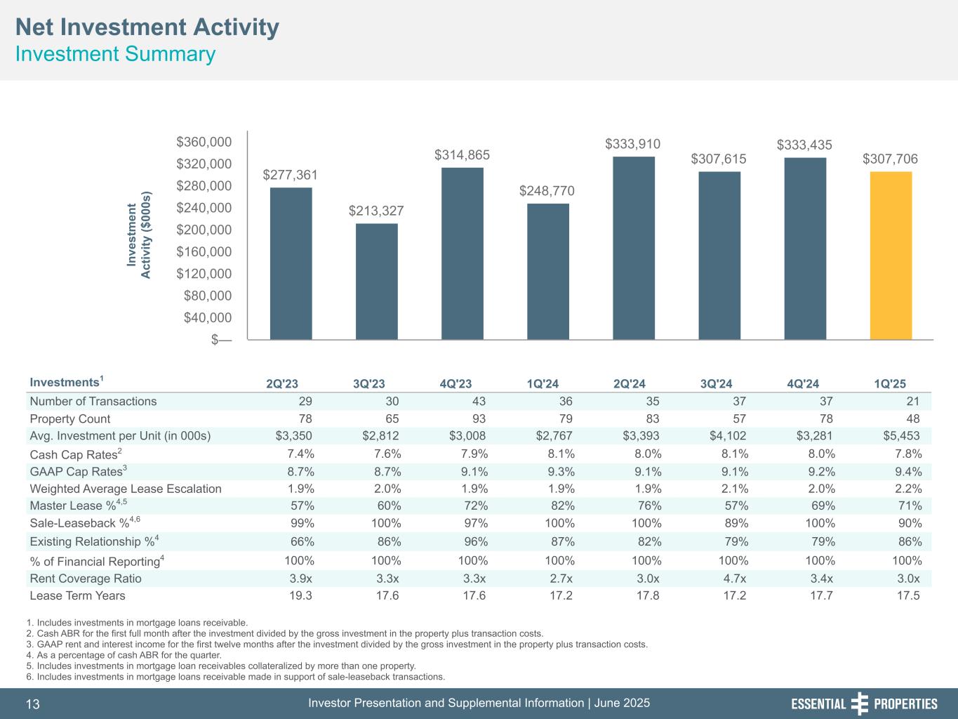 Investor Presentation and Supplemental Information | June 202513 254, 192, 59 75, 108, 127 146, 204, 238 0, 0, 0 38, 169, 224 153, 223, 227 Net Investment Activity Investment Summary 242, 242, 242 1. Includes investments in mortgage loans receivable. 2. Cash ABR for the first full month after the investment divided by the gross investment in the property plus transaction costs. 3. GAAP rent and interest income for the first twelve months after the investment divided by the gross investment in the property plus transaction costs. 4. As a percentage of cash ABR for the quarter. 5. Includes investments in mortgage loan receivables collateralized by more than one property. 6. Includes investments in mortgage loans receivable made in support of sale-leaseback transactions. Investments1 2Q'23 3Q'23 4Q'23 1Q'24 2Q'24 3Q'24 4Q'24 1Q'25 Number of Transactions 29 30 43 36 35 37 37 21 Property Count 78 65 93 79 83 57 78 48 Avg. Investment per Unit (in 000s) $3,350 $2,812 $3,008 $2,767 $3,393 $4,102 $3,281 $5,453 Cash Cap Rates2 7.4 % 7.6 % 7.9 % 8.1 % 8.0 % 8.1 % 8.0 % 7.8 % GAAP Cap Rates3 8.7 % 8.7 % 9.1 % 9.3 % 9.1 % 9.1 % 9.2 % 9.4 % Weighted Average Lease Escalation 1.9 % 1.8 % 2.0 % 1.8 % 1.9 % 1.8 % 1.9 % 1.9 % 2.1 % 2.0 % 2.2 % Master Lease %4,5 57 % 60 % 72 % 82 % 76 % 57 % 69 % 71 % Sale-Leaseback %4,6 99 % 100 % 97 % 100 % 100 % 89 % 100 % 90 % Existing Relationship %4 66 % 86 % 96 % 87 % 82 % 79 % 79 % 86 % % of Financial Reporting4 100 % 100 % 100 % 100 % 100 % 100 % 100 % 100 % Rent Coverage Ratio 3.9x 3.3x 3.3x 2.7x 3.0x 4.7x 3.4x 3.0x Lease Term Years 19.3 17.6 17.6 17.2 17.8 17.2 17.7 17.5 $277,361 $213,327 $314,865 $248,770 $333,910 $307,615 $333,435 $307,706 $— $40,000 $80,000 $120,000 $160,000 $200,000 $240,000 $280,000 $320,000 $360,000 In ve st m en t A ct iv ity ($ 00 0s )