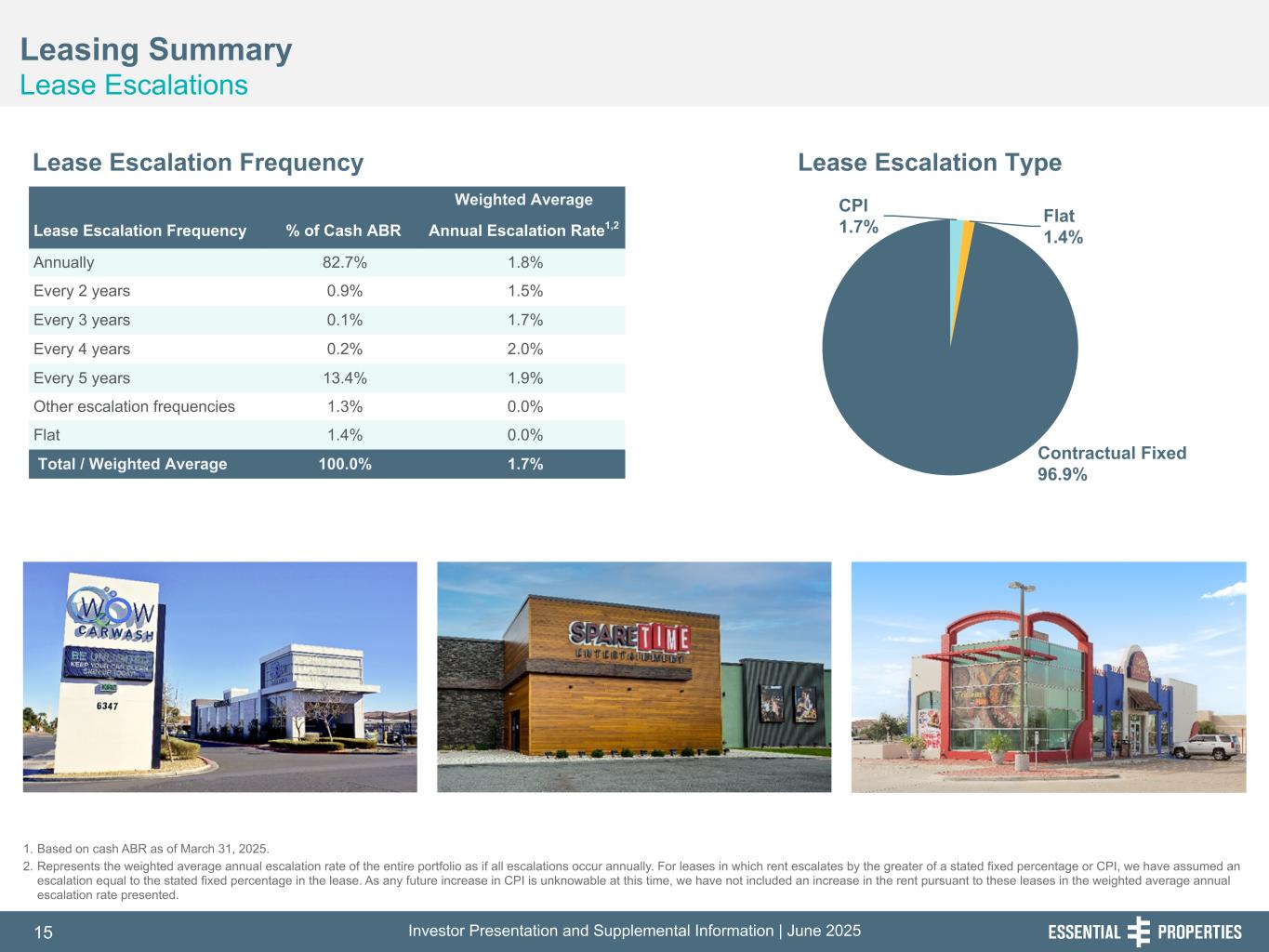 Investor Presentation and Supplemental Information | June 202515 254, 192, 59 75, 108, 127 146, 204, 238 0, 0, 0 38, 169, 224 153, 223, 227 Leasing Summary Lease Escalations 242, 242, 242 1. Based on cash ABR as of March 31, 2025. 2. Represents the weighted average annual escalation rate of the entire portfolio as if all escalations occur annually. For leases in which rent escalates by the greater of a stated fixed percentage or CPI, we have assumed an escalation equal to the stated fixed percentage in the lease. As any future increase in CPI is unknowable at this time, we have not included an increase in the rent pursuant to these leases in the weighted average annual escalation rate presented. Lease Escalation Frequency Lease Escalation Type Weighted Average Lease Escalation Frequency % of Cash ABR Annual Escalation Rate1,2 Annually 82.7% 1.8% Every 2 years 0.9% 1.5% Every 3 years 0.1% 1.7% Every 4 years 0.2% 2.0% Every 5 years 13.4% 1.9% Other escalation frequencies 1.3% 0.0% Flat 1.4% 0.0% Total / Weighted Average 100.0% 1.7% CPI 1.7% Flat 1.4% Contractual Fixed 96.9%