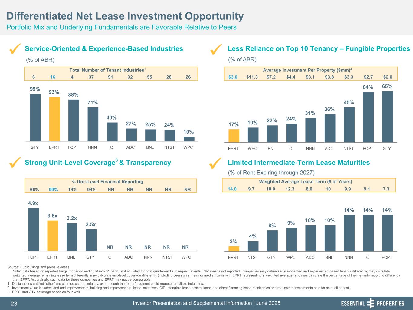 Investor Presentation and Supplemental Information | June 202523 254, 192, 59 75, 108, 127 146, 204, 238 0, 0, 0 38, 169, 224 153, 223, 227 Source: Public filings and press releases. Note: Data based on reported filings for period ending March 31, 2025, not adjusted for post quarter-end subsequent events. ‘NR’ means not reported. Companies may define service-oriented and experienced-based tenants differently, may calculate weighted average remaining lease term differently, may calculate unit-level coverage differently (including peers on a mean or median basis with EPRT representing a weighted average) and may calculate the percentage of their tenants reporting differently than EPRT. Accordingly, such data for these companies and EPRT may not be comparable. 1. Designations entitled “other” are counted as one industry, even though the “other” segment could represent multiple industries. 2. Investment value includes land and improvements, building and improvements, lease incentives, CIP, intangible lease assets, loans and direct financing lease receivables and real estate investments held for sale, all at cost. 3. EPRT and GTY coverage based on four-wall. Differentiated Net Lease Investment Opportunity Portfolio Mix and Underlying Fundamentals are Favorable Relative to Peers Strong Unit-Level Coverage3 & Transparency Service-Oriented & Experience-Based Industries Limited Intermediate-Term Lease Maturities 242, 242, 242 (% of ABR) (% of Rent Expiring through 2027) Less Reliance on Top 10 Tenancy – Fungible Properties (% of ABR) 17% 19% 22% 24% 31% 36% 45% 64% 65% EPRT WPC BNL O NNN ADC NTST FCPT GTY 99% 93% 88% 71% 40% 27% 25% 24% 10% GTY EPRT FCPT NNN O ADC BNL NTST WPC 4.9x 3.5x 3.2x 2.5x FCPT EPRT BNL GTY O ADC NNN NTST WPC Total Number of Tenant Industries1 % Unit-Level Financial Reporting Average Investment Per Property ($mm)2 Weighted Average Lease Term (# of Years) NR NR NR NR 2% 4% 8% 9% 10% 10% 14% 14% 14% EPRT NTST GTY WPC ADC BNL NNN O FCPT 6 16 4 37 91 32 55 26 26 $3.0 $11.3 $7.2 $4.4 $3.1 $3.8 $3.3 $2.7 $2.0 66% 99% 14% 94% NR NR NR NR NR 14.0 9.7 10.0 12.3 8.0 10 9.9 9.1 7.3 NR