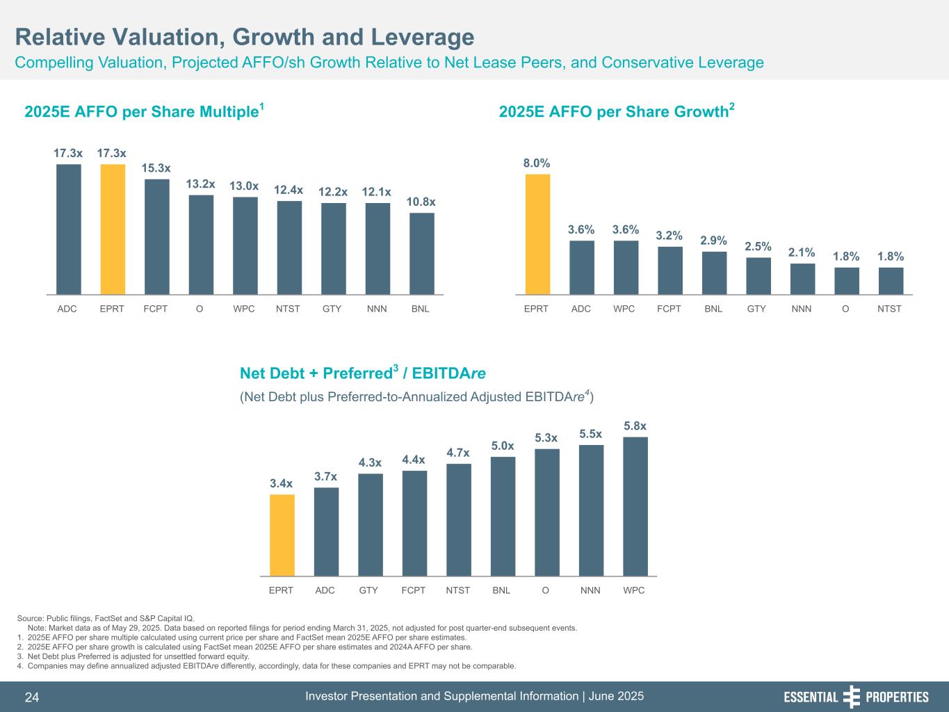 Investor Presentation and Supplemental Information | June 202524 254, 192, 59 75, 108, 127 146, 204, 238 0, 0, 0 38, 169, 224 153, 223, 227 Source: Public filings, FactSet and S&P Capital IQ. Note: Market data as of May 29, 2025. Data based on reported filings for period ending March 31, 2025, not adjusted for post quarter-end subsequent events. 1. 2025E AFFO per share multiple calculated using current price per share and FactSet mean 2025E AFFO per share estimates. 2. 2025E AFFO per share growth is calculated using FactSet mean 2025E AFFO per share estimates and 2024A AFFO per share. 3. Net Debt plus Preferred is adjusted for unsettled forward equity. 4. Companies may define annualized adjusted EBITDAre differently, accordingly, data for these companies and EPRT may not be comparable. 2025E AFFO per Share Multiple1 2025E AFFO per Share Growth2 242, 242, 242 Relative Valuation, Growth and Leverage Compelling Valuation, Projected AFFO/sh Growth Relative to Net Lease Peers, and Conservative Leverage Net Debt + Preferred3 / EBITDAre (Net Debt plus Preferred-to-Annualized Adjusted EBITDAre4) 3.4x 3.7x 4.3x 4.4x 4.7x 5.0x 5.3x 5.5x 5.8x EPRT ADC GTY FCPT NTST BNL O NNN WPC 8.0% 3.6% 3.6% 3.2% 2.9% 2.5% 2.1% 1.8% 1.8% EPRT ADC WPC FCPT BNL GTY NNN O NTST 17.3x 17.3x 15.3x 13.2x 13.0x 12.4x 12.2x 12.1x 10.8x ADC EPRT FCPT O WPC NTST GTY NNN BNL