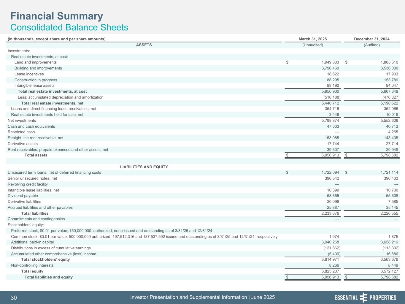 Investor Presentation and Supplemental Information | June 202530 254, 192, 59 75, 108, 127 146, 204, 238 0, 0, 0 38, 169, 224 153, 223, 227 Financial Summary Consolidated Balance Sheets 242, 242, 242 (in thousands, except share and per share amounts) March 31, 2025 December 31, 2024 ASSETS (Unaudited) (Audited) Investments: Real estate investments, at cost: Land and improvements $ 1,949,333 $ 1,865,610 Building and improvements 3,796,460 3,536,000 Lease incentives 18,622 17,903 Construction in progress 88,295 153,789 Intangible lease assets 98,190 94,047 Total real estate investments, at cost 5,950,900 5,667,349 Less: accumulated depreciation and amortization (510,188) (476,827) Total real estate investments, net 5,440,712 5,190,522 Loans and direct financing lease receivables, net 354,716 352,066 Real estate investments held for sale, net 3,446 10,018 Net investments 5,798,874 5,552,606 Cash and cash equivalents 47,003 40,713 Restricted cash — 4,265 Straight-line rent receivable, net 153,985 143,435 Derivative assets 17,744 27,714 Rent receivables, prepaid expenses and other assets, net 39,307 29,949 Total assets $ 6,056,913 $ 5,798,682 LIABILITIES AND EQUITY Unsecured term loans, net of deferred financing costs $ 1,722,094 $ 1,721,114 Senior unsecured notes, net 396,542 396,403 Revolving credit facility — — Intangible lease liabilities, net 10,399 10,700 Dividend payable 58,655 55,608 Derivative liabilities 20,099 7,585 Accrued liabilities and other payables 25,887 35,145 Total liabilities 2,233,676 2,226,555 Commitments and contingencies — — Stockholders' equity: Preferred stock, $0.01 par value; 150,000,000 authorized; none issued and outstanding as of 3/31/25 and 12/31/24 — — Common stock, $0.01 par value; 500,000,000 authorized; 197,512,316 and 187,537,592 issued and outstanding as of 3/31/25 and 12/31/24, respectively 1,974 1,875 Additional paid-in capital 3,940,268 3,658,219 Distributions in excess of cumulative earnings (121,862) (113,302) Accumulated other comprehensive (loss) income (5,409) 16,886 Total stockholders' equity 3,814,971 3,563,678 Non-controlling interests 8,266 8,449 Total equity 3,823,237 3,572,127 Total liabilities and equity $ 6,056,913 $ 5,798,682