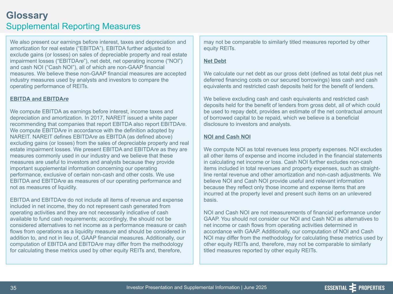 Investor Presentation and Supplemental Information | June 202534 254, 192, 59 75, 108, 127 146, 204, 238 0, 0, 0 38, 169, 224 153, 223, 227 Glossary Supplemental Reporting Measures 242, 242, 242 FFO, Core FFO and AFFO Our reported results are presented in accordance with U.S. generally accepted accounting principles ("GAAP"). We also disclose funds from operations (“FFO”), core funds from operations (“Core FFO”) and adjusted funds from operations (“AFFO”), each of which is a non-GAAP financial measures. We believe these non-GAAP financial measures are industry measures used by analysts and investors to compare the operating performance of REITs. We compute FFO in accordance with the definition adopted by the Board of Governors of the National Association of Real Estate Investment Trusts ("NAREIT"). NAREIT defines FFO as GAAP net income or loss adjusted to exclude extraordinary items (as defined by GAAP), net gain or loss from sales of depreciable real estate assets, impairment write-downs associated with depreciable real estate assets and real estate-related depreciation and amortization (excluding amortization of deferred financing costs and depreciation of non-real estate assets), including the pro rata share of such adjustments of unconsolidated subsidiaries. FFO is used by management, and may be useful to investors and analysts, to facilitate meaningful comparisons of operating performance between periods and among our peers primarily because it excludes the effect of real estate depreciation and amortization and net gains and losses on sales (which are dependent on historical costs and implicitly assume that the value of real estate diminishes predictably over time, rather than fluctuating based on existing market conditions). We compute Core FFO by adjusting FFO, as defined by NAREIT, to exclude certain GAAP income and expense amounts that we believe are infrequent and unusual in nature and/or not related to our core real estate operations. Exclusion of these items from similar FFO-type metrics is common within the equity REIT industry, and management believes that presentation of Core FFO provides investors with a metric to assist in their evaluation of our operating performance across multiple periods and in comparison to the operating performance of our peers, because it removes the effect of unusual items that are not expected to impact our operating performance on an ongoing basis. Core FFO is used by management in evaluating the performance of our core business operations. Items included in calculating FFO that may be excluded in calculating Core FFO include certain transaction related gains, losses, income or expense or other non-core amounts as they occur. To derive AFFO, we modify the NAREIT computation of FFO to include other adjustments to GAAP net income related to certain items that we believe are not indicative of our operating performance, including straight- line rental revenue, non-cash interest expense, non-cash compensation expense, other amortization expense, other non-cash adjustments and capitalized interest expense. Such items may cause short-term fluctuations in net income but have no impact on operating cash flows or long-term operating performance. We believe that AFFO is an additional useful supplemental measure for investors to consider to assess our operating performance without the distortions created by non-cash and certain other revenues and expenses. FFO, Core FFO and AFFO do not include all items of revenue and expense included in net income, they do not represent cash generated from operating activities, and they are not necessarily indicative of cash available to fund cash requirements; accordingly, they should not be considered alternatives to net income as a performance measure or cash flows from operations as a liquidity measure and should be considered in addition to, and not in lieu of, GAAP financial measures. Additionally, our computation of FFO, Core FFO and AFFO may differ from the methodology for calculating these metrics used by other equity REITs and, therefore, may not be comparable to similarly titled measures reported by other equity REITs.