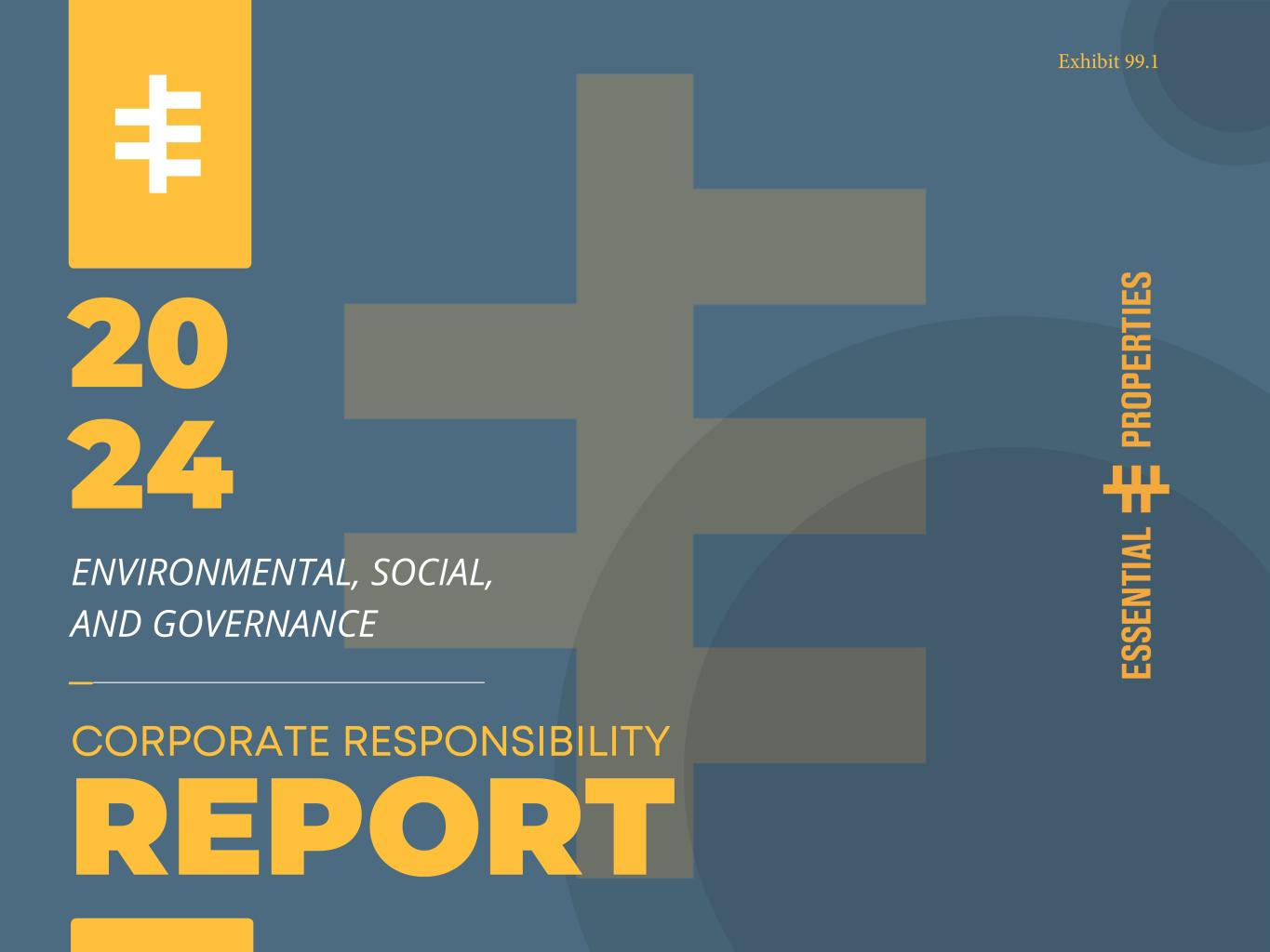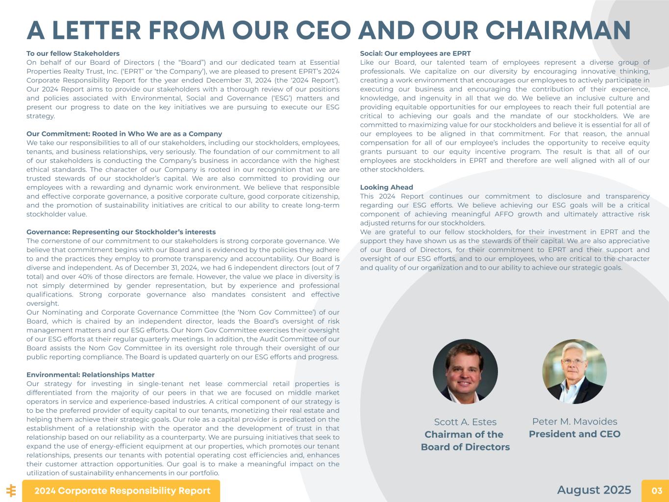 August Peter M. Mavoides President and CEO A LETTER FROM OUR CEO AND OUR CHAIRMAN Scott A. Estes Chairman of the Board of Directors 2024 Corporate Responsibility Report 03 To our fellow Stakeholders On behalf of our Board of Directors ( the “Board”) and our dedicated team at Essential Properties Realty Trust, Inc. (‘EPRT’ or ‘the Company’), we are pleased to present EPRT’s 2024 Corporate Responsibility Report for the year ended December 31, 2024 (the ‘2024 Report’). Our 2024 Report aims to provide our stakeholders with a thorough review of our positions and policies associated with Environmental, Social and Governance (‘ESG’) matters and present our progress to date on the key initiatives we are pursuing to execute our ESG strategy. Our Commitment: Rooted in Who We are as a Company We take our responsibilities to all of our stakeholders, including our stockholders, employees, tenants, and business relationships, very seriously. The foundation of our commitment to all of our stakeholders is conducting the Company’s business in accordance with the highest ethical standards. The character of our Company is rooted in our recognition that we are trusted stewards of our stockholder’s capital. We are also committed to providing our employees with a rewarding and dynamic work environment. We believe that responsible and effective corporate governance, a positive corporate culture, good corporate citizenship, and the promotion of sustainability initiatives are critical to our ability to create long-term stockholder value. Governance: Representing our Stockholder’s interests The cornerstone of our commitment to our stakeholders is strong corporate governance. We believe that commitment begins with our Board and is evidenced by the policies they adhere to and the practices they employ to promote transparency and accountability. Our Board is diverse and independent. As of December 31, 2024, we had 6 independent directors (out of 7 total) and over 40% of those directors are female. However, the value we place in diversity is not simply determined by gender representation, but by experience and professional qualifications. Strong corporate governance also mandates consistent and effective oversight. Our Nominating and Corporate Governance Committee (the ‘Nom Gov Committee’) of our Board, which is chaired by an independent director, leads the Board’s oversight of risk management matters and our ESG efforts. Our Nom Gov Committee exercises their oversight of our ESG efforts at their regular quarterly meetings. In addition, the Audit Committee of our Board assists the Nom Gov Committee in its oversight role through their oversight of our public reporting compliance. The Board is updated quarterly on our ESG efforts and progress. Environmental: Relationships Matter Our strategy for investing in single-tenant net lease commercial retail properties is differentiated from the majority of our peers in that we are focused on middle market operators in service and experience-based industries. A critical component of our strategy is to be the preferred provider of equity capital to our tenants, monetizing their real estate and helping them achieve their strategic goals. Our role as a capital provider is predicated on the establishment of a relationship with the operator and the development of trust in that relationship based on our reliability as a counterparty. We are pursuing initiatives that seek to expand the use of energy-efficient equipment at our properties, which promotes our tenant relationships, presents our tenants with potential operating cost efficiencies and, enhances their customer attraction opportunities. Our goal is to make a meaningful impact on the utilization of sustainability enhancements in our portfolio. Social: Our employees are EPRT Like our Board, our talented team of employees represent a diverse group of professionals. We capitalize on our diversity by encouraging innovative thinking, creating a work environment that encourages our employees to actively participate in executing our business and encouraging the contribution of their experience, knowledge, and ingenuity in all that we do. We believe an inclusive culture and providing equitable opportunities for our employees to reach their full potential are critical to achieving our goals and the mandate of our stockholders. We are committed to maximizing value for our stockholders and believe it is essential for all of our employees to be aligned in that commitment. For that reason, the annual compensation for all of our employee’s includes the opportunity to receive equity grants pursuant to our equity incentive program. The result is that all of our employees are stockholders in EPRT and therefore are well aligned with all of our other stockholders. Looking Ahead This 2024 Report continues our commitment to disclosure and transparency regarding our ESG efforts. We believe achieving our ESG goals will be a critical component of achieving meaningful AFFO growth and ultimately attractive risk adjusted returns for our stockholders. We are grateful to our fellow stockholders, for their investment in EPRT and the support they have shown us as the stewards of their capital. We are also appreciative of our Board of Directors, for their commitment to EPRT and their support and oversight of our ESG efforts, and to our employees, who are critical to the character and quality of our organization and to our ability to achieve our strategic goals. August 2025