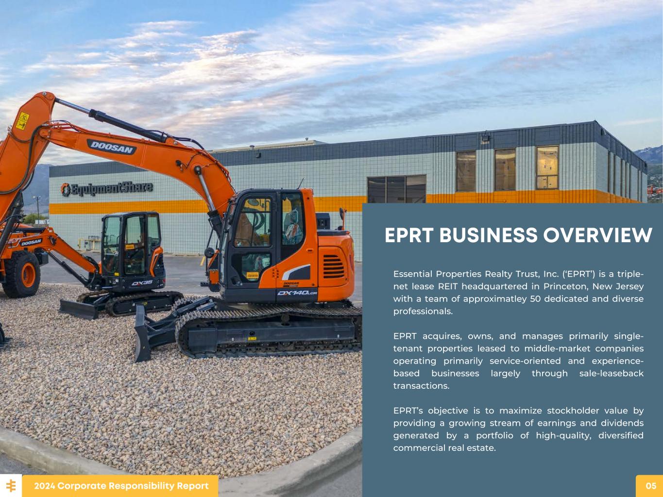 Essential Properties EPRT BUSINESS OVERVIEW Essential Properties Realty Trust, Inc. (‘EPRT’) is a triple- net lease REIT headquartered in Princeton, New Jersey with a team of approximatley 50 dedicated and diverse professionals. EPRT acquires, owns, and manages primarily single- tenant properties leased to middle-market companies operating primarily service-oriented and experience- based businesses largely through sale-leaseback transactions. EPRT’s objective is to maximize stockholder value by providing a growing stream of earnings and dividends generated by a portfolio of high-quality, diversified commercial real estate. 2024 Corporate Responsibility Report 05