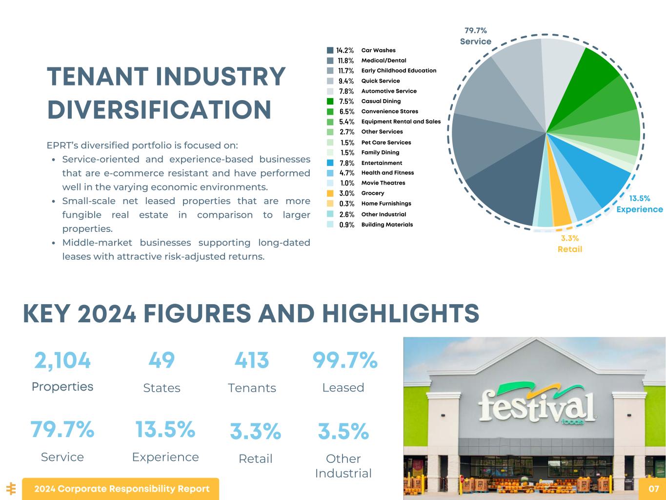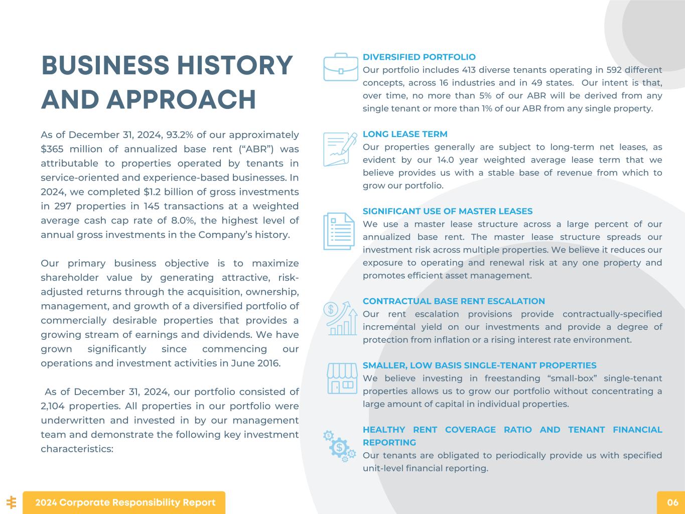 BUSINESS HISTORY AND APPROACH As of December 31, 2024, 93.2% of our approximately $365 million of annualized base rent (“ABR”) was attributable to properties operated by tenants in service-oriented and experience-based businesses. In 2024, we completed $1.2 billion of gross investments in 297 properties in 145 transactions at a weighted average cash cap rate of 8.0%, the highest level of annual gross investments in the Company’s history. Our primary business objective is to maximize shareholder value by generating attractive, risk- adjusted returns through the acquisition, ownership, management, and growth of a diversified portfolio of commercially desirable properties that provides a growing stream of earnings and dividends. We have grown significantly since commencing our operations and investment activities in June 2016. As of December 31, 2024, our portfolio consisted of 2,104 properties. All properties in our portfolio were underwritten and invested in by our management team and demonstrate the following key investment characteristics: DIVERSIFIED PORTFOLIO Our portfolio includes 413 diverse tenants operating in 592 different concepts, across 16 industries and in 49 states. Our intent is that, over time, no more than 5% of our ABR will be derived from any single tenant or more than 1% of our ABR from any single property. LONG LEASE TERM Our properties generally are subject to long-term net leases, as evident by our 14.0 year weighted average lease term that we believe provides us with a stable base of revenue from which to grow our portfolio. SIGNIFICANT USE OF MASTER LEASES We use a master lease structure across a large percent of our annualized base rent. The master lease structure spreads our investment risk across multiple properties. We believe it reduces our exposure to operating and renewal risk at any one property and promotes efficient asset management. CONTRACTUAL BASE RENT ESCALATION Our rent escalation provisions provide contractually-specified incremental yield on our investments and provide a degree of protection from inflation or a rising interest rate environment. SMALLER, LOW BASIS SINGLE-TENANT PROPERTIES We believe investing in freestanding “small-box” single-tenant properties allows us to grow our portfolio without concentrating a large amount of capital in individual properties. HEALTHY RENT COVERAGE RATIO AND TENANT FINANCIAL REPORTING Our tenants are obligated to periodically provide us with specified unit-level financial reporting. 2024 Corporate Responsibility Report 06