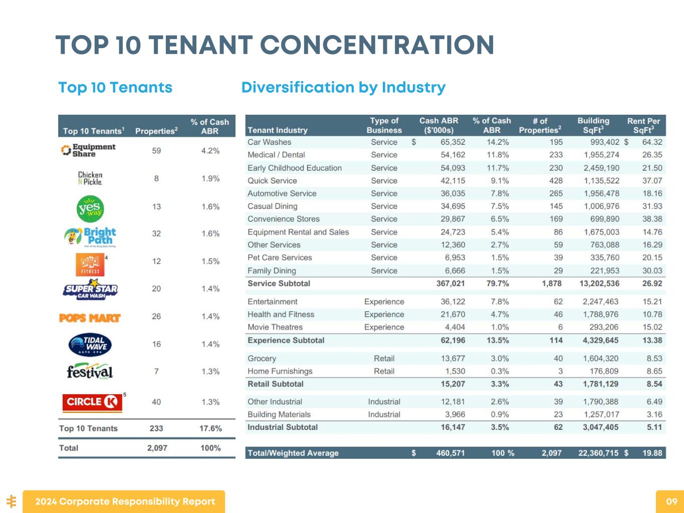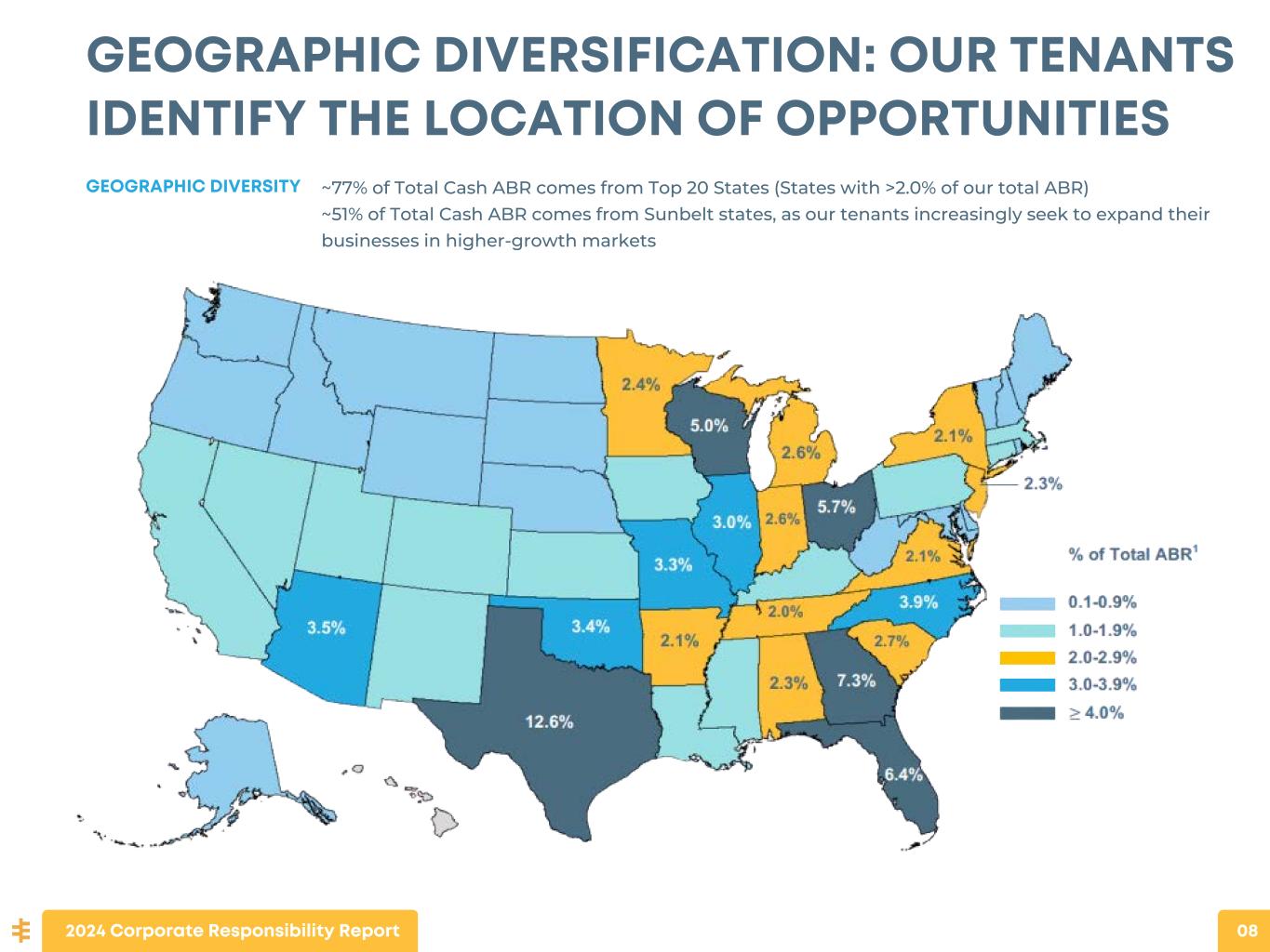 GEOGRAPHIC DIVERSIFICATION: OUR TENANTS IDENTIFY THE LOCATION OF OPPORTUNITIES ~77% of Total Cash ABR comes from Top 20 States (States with >2.0% of our total ABR) ~51% of Total Cash ABR comes from Sunbelt states, as our tenants increasingly seek to expand their businesses in higher-growth markets GEOGRAPHIC DIVERSITY 2024 Corporate Responsibility Report 08