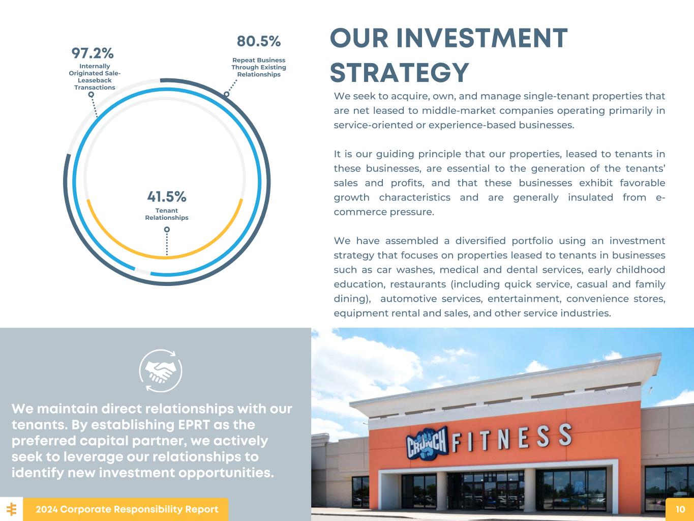 We maintain direct relationships with our tenants. By establishing EPRT as the preferred capital partner, we actively seek to leverage our relationships to identify new investment opportunities. Repeat Business Through Existing Relationships Internally Originated Sale- Leaseback Transactions 97.2% 80.5% Tenant Relationships 41.5% OUR INVESTMENT STRATEGY We seek to acquire, own, and manage single-tenant properties that are net leased to middle-market companies operating primarily in service-oriented or experience-based businesses. It is our guiding principle that our properties, leased to tenants in these businesses, are essential to the generation of the tenants’ sales and profits, and that these businesses exhibit favorable growth characteristics and are generally insulated from e- commerce pressure. We have assembled a diversified portfolio using an investment strategy that focuses on properties leased to tenants in businesses such as car washes, medical and dental services, early childhood education, restaurants (including quick service, casual and family dining), automotive services, entertainment, convenience stores, equipment rental and sales, and other service industries. 2024 Corporate Responsibility Report 10