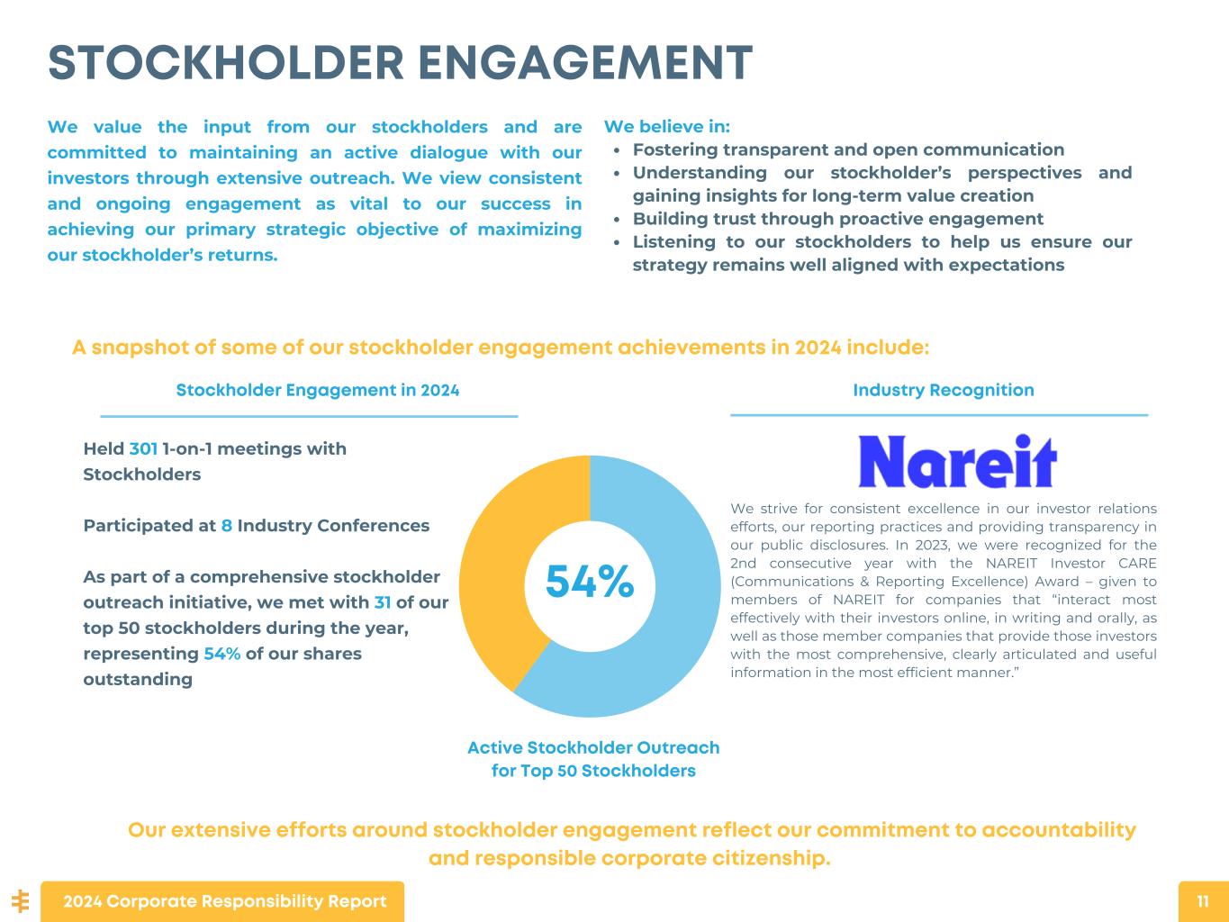 Held 301 1-on-1 meetings with Stockholders Participated at 8 Industry Conferences As part of a comprehensive stockholder outreach initiative, we met with 31 of our top 50 stockholders during the year, representing 54% of our shares outstanding Our extensive efforts around stockholder engagement reflect our commitment to accountability and responsible corporate citizenship. STOCKHOLDER ENGAGEMENT We value the input from our stockholders and are committed to maintaining an active dialogue with our investors through extensive outreach. We view consistent and ongoing engagement as vital to our success in achieving our primary strategic objective of maximizing our stockholder’s returns. 54% We believe in: Fostering transparent and open communication Understanding our stockholder’s perspectives and gaining insights for long-term value creation Building trust through proactive engagement Listening to our stockholders to help us ensure our strategy remains well aligned with expectations A snapshot of some of our stockholder engagement achievements in 2024 include: Stockholder Engagement in 2024 Industry Recognition Active Stockholder Outreach for Top 50 Stockholders We strive for consistent excellence in our investor relations efforts, our reporting practices and providing transparency in our public disclosures. In 2023, we were recognized for the 2nd consecutive year with the NAREIT Investor CARE (Communications & Reporting Excellence) Award – given to members of NAREIT for companies that “interact most effectively with their investors online, in writing and orally, as well as those member companies that provide those investors with the most comprehensive, clearly articulated and useful information in the most efficient manner.” 2024 Corporate Responsibility Report 11