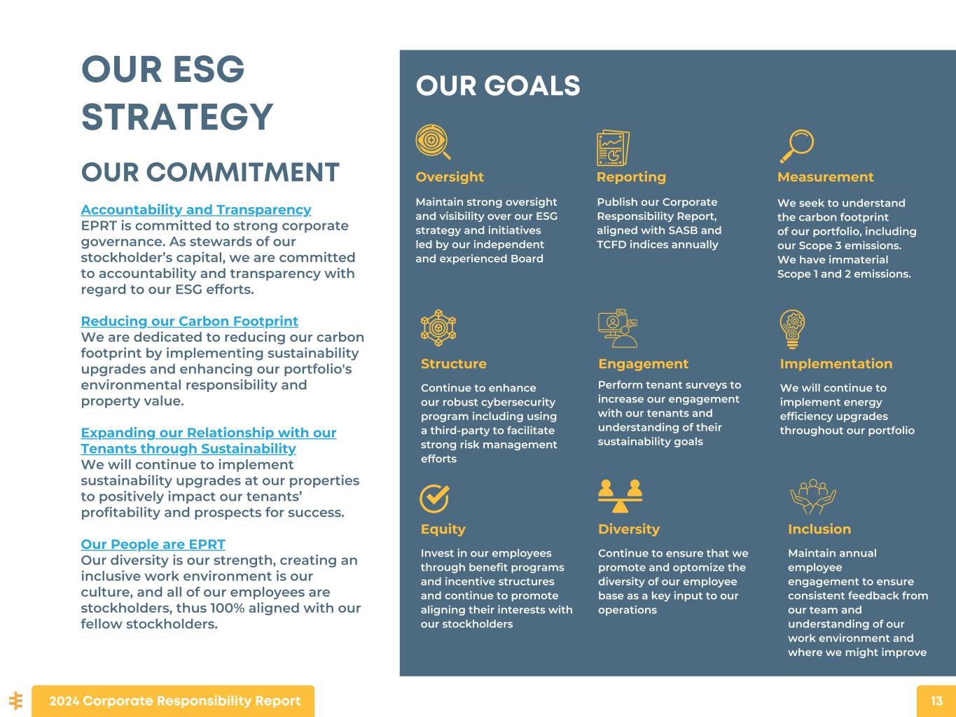 ENVIRONMENTAL, SOCIAL, AND GOVERNANCE (ESG) We believe that responsible and effective corporate governance, a positive corporate culture, good corporate citizenship, and the promotion of sustainability initiatives are critical to our ability to create long-term stockholder value. Our approach to ESG begins with strong corporate governance. Our position on sustainability is that reducing our carbon footprint and that of our tenants is an important part of our corporate objective. A corporate culture that provides equitable opportunities for our employees is a critical ingredient for our future success. 2024 Corporate Responsibility Report 12