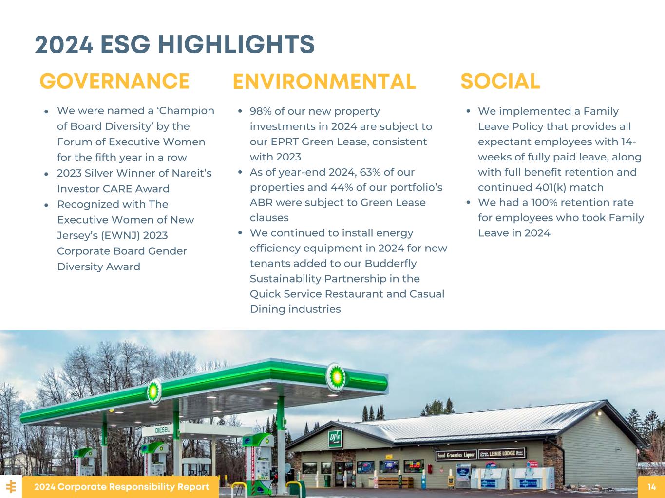 We were named a ‘Champion of Board Diversity’ by the Forum of Executive Women for the fifth year in a row 2023 Silver Winner of Nareit’s Investor CARE Award Recognized with The Executive Women of New Jersey’s (EWNJ) 2023 Corporate Board Gender Diversity Award GOVERNANCE 98% of our new property investments in 2024 are subject to our EPRT Green Lease, consistent with 2023 As of year-end 2024, 63% of our properties and 44% of our portfolio’s ABR were subject to Green Lease clauses We continued to install energy efficiency equipment in 2024 for new tenants added to our Budderfly Sustainability Partnership in the Quick Service Restaurant and Casual Dining industries ENVIRONMENTAL 2024 ESG HIGHLIGHTS 2024 Corporate Responsibility Report 14 We implemented a Family Leave Policy that provides all expectant employees with 14- weeks of fully paid leave, along with full benefit retention and continued 401(k) match We had a 100% retention rate for employees who took Family Leave in 2024 SOCIAL