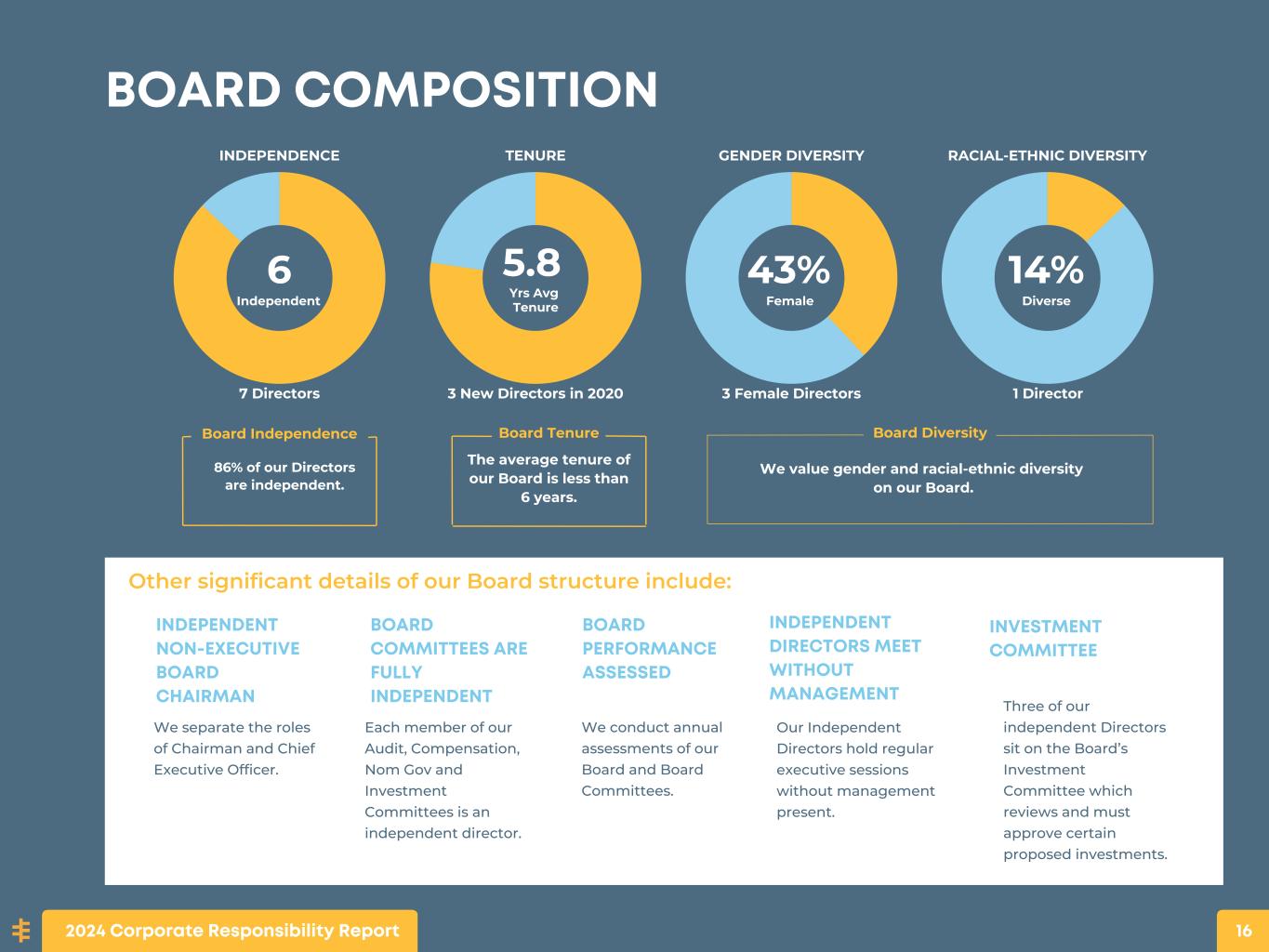 Board Tenure We value gender and racial-ethnic diversity on our Board. Board Diversity Three of our independent Directors sit on the Board’s Investment Committee which reviews and must approve certain proposed investments. 86% of our Directors are independent. Board Independence The average tenure of our Board is less than 6 years. Other significant details of our Board structure include: INDEPENDENT NON-EXECUTIVE BOARD CHAIRMAN We separate the roles of Chairman and Chief Executive Officer. BOARD COMPOSITION 6 Independent 5.8 Yrs Avg Tenure 43% Female 14% Diverse INDEPENDENCE TENURE GENDER DIVERSITY RACIAL-ETHNIC DIVERSITY 7 Directors 3 New Directors in 2020 3 Female Directors 1 Director We conduct annual assessments of our Board and Board Committees. Each member of our Audit, Compensation, Nom Gov and Investment Committees is an independent director. Our Independent Directors hold regular executive sessions without management present. BOARD COMMITTEES ARE FULLY INDEPENDENT BOARD PERFORMANCE ASSESSED INDEPENDENT DIRECTORS MEET WITHOUT MANAGEMENT INVESTMENT COMMITTEE 2024 Corporate Responsibility Report 16