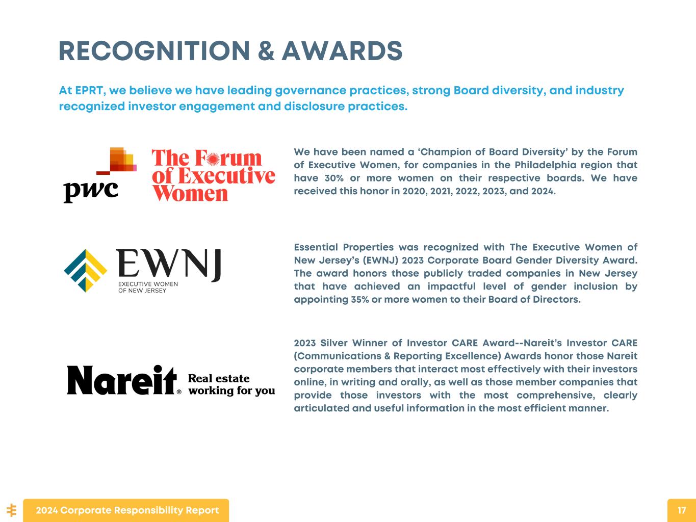 RECOGNITION & AWARDS At EPRT, we believe we have leading governance practices, strong Board diversity, and industry recognized investor engagement and disclosure practices. Essential Properties was recognized with The Executive Women of New Jersey’s (EWNJ) 2023 Corporate Board Gender Diversity Award. The award honors those publicly traded companies in New Jersey that have achieved an impactful level of gender inclusion by appointing 35% or more women to their Board of Directors. We have been named a ‘Champion of Board Diversity’ by the Forum of Executive Women, for companies in the Philadelphia region that have 30% or more women on their respective boards. We have received this honor in 2020, 2021, 2022, 2023, and 2024. 2023 Silver Winner of Investor CARE Award--Nareit’s Investor CARE (Communications & Reporting Excellence) Awards honor those Nareit corporate members that interact most effectively with their investors online, in writing and orally, as well as those member companies that provide those investors with the most comprehensive, clearly articulated and useful information in the most efficient manner. 2024 Corporate Responsibility Report 17