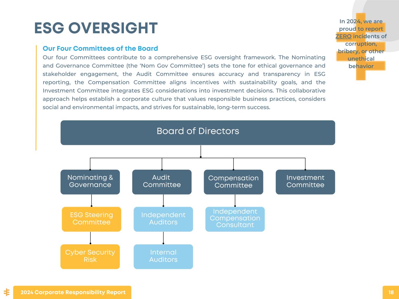 18 ESG OVERSIGHT Board of Directors Audit Committee Nominating & Governance Compensation Committee Investment Committee ESG Steering Committee Cyber Security Risk Independent Auditors Independent Compensation Consultant Our Four Committees of the Board Our four Committees contribute to a comprehensive ESG oversight framework. The Nominating and Governance Committee (the ‘Nom Gov Committee’) sets the tone for ethical governance and stakeholder engagement, the Audit Committee ensures accuracy and transparency in ESG reporting, the Compensation Committee aligns incentives with sustainability goals, and the Investment Committee integrates ESG considerations into investment decisions. This collaborative approach helps establish a corporate culture that values responsible business practices, considers social and environmental impacts, and strives for sustainable, long-term success. In 2024, we are proud to report ZERO incidents of corruption, bribery, or other unethical behavior Internal Auditors 2024 Corporate Responsibility Report 18
