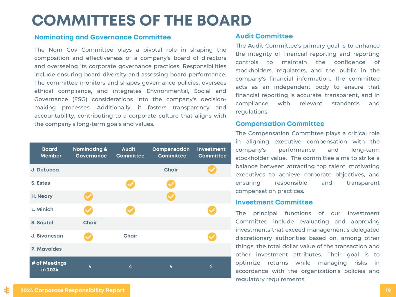 Board Member Nominating & Governance Audit   Committee Compensation Committee Investment Committee J. DeLucca     Chair   S. Estes         H. Neary       L. Minich       S. Sautel Chair       J. Sivanesan Chair     P. Mavoides       # of Meetings in 2024 4 4 4 2 COMMITTEES OF THE BOARD Investment Committee The principal functions of our Investment Committee include evaluating and approving investments that exceed management’s delegated discretionary authorities based on, among other things, the total dollar value of the transaction and other investment attributes. Their goal is to optimize returns while managing risks in accordance with the organization's policies and regulatory requirements. Compensation Committee The Compensation Committee plays a critical role in aligning executive compensation with the company's performance and long-term stockholder value. The committee aims to strike a balance between attracting top talent, motivating executives to achieve corporate objectives, and ensuring responsible and transparent compensation practices. Audit Committee The Audit Committee's primary goal is to enhance the integrity of financial reporting and reporting controls to maintain the confidence of stockholders, regulators, and the public in the company's financial information. The committee acts as an independent body to ensure that financial reporting is accurate, transparent, and in compliance with relevant standards and regulations. Nominating and Governance Committee The Nom Gov Committee plays a pivotal role in shaping the composition and effectiveness of a company's board of directors and overseeing its corporate governance practices. Responsibilities include ensuring board diversity and assessing board performance. The committee monitors and shapes governance policies, oversees ethical compliance, and integrates Environmental, Social and Governance (ESG) considerations into the company's decision- making processes. Additionally, it fosters transparency and accountability, contributing to a corporate culture that aligns with the company's long-term goals and values. 2024 Corporate Responsibility Report 19