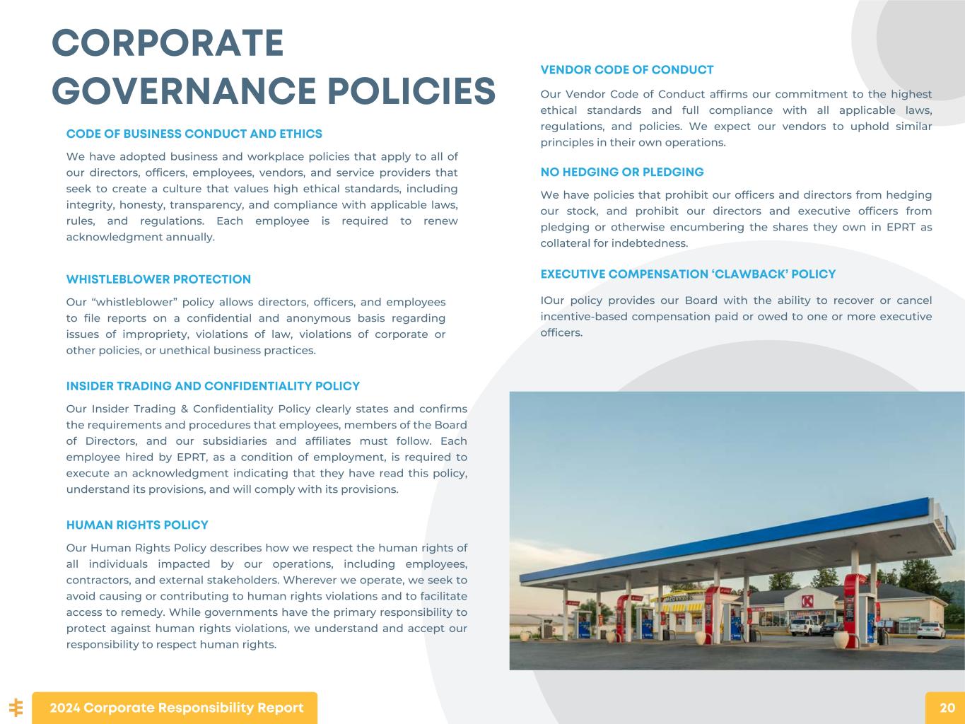 CORPORATE GOVERNANCE POLICIES CODE OF BUSINESS CONDUCT AND ETHICS We have adopted business and workplace policies that apply to all of our directors, officers, employees, vendors, and service providers that seek to create a culture that values high ethical standards, including integrity, honesty, transparency, and compliance with applicable laws, rules, and regulations. Each employee is required to renew acknowledgment annually. WHISTLEBLOWER PROTECTION Our “whistleblower” policy allows directors, officers, and employees to file reports on a confidential and anonymous basis regarding issues of impropriety, violations of law, violations of corporate or other policies, or unethical business practices. INSIDER TRADING AND CONFIDENTIALITY POLICY Our Insider Trading & Confidentiality Policy clearly states and confirms the requirements and procedures that employees, members of the Board of Directors, and our subsidiaries and affiliates must follow. Each employee hired by EPRT, as a condition of employment, is required to execute an acknowledgment indicating that they have read this policy, understand its provisions, and will comply with its provisions. HUMAN RIGHTS POLICY Our Human Rights Policy describes how we respect the human rights of all individuals impacted by our operations, including employees, contractors, and external stakeholders. Wherever we operate, we seek to avoid causing or contributing to human rights violations and to facilitate access to remedy. While governments have the primary responsibility to protect against human rights violations, we understand and accept our responsibility to respect human rights. VENDOR CODE OF CONDUCT Our Vendor Code of Conduct affirms our commitment to the highest ethical standards and full compliance with all applicable laws, regulations, and policies. We expect our vendors to uphold similar principles in their own operations. NO HEDGING OR PLEDGING We have policies that prohibit our officers and directors from hedging our stock, and prohibit our directors and executive officers from pledging or otherwise encumbering the shares they own in EPRT as collateral for indebtedness. EXECUTIVE COMPENSATION ‘CLAWBACK’ POLICY IOur policy provides our Board with the ability to recover or cancel incentive-based compensation paid or owed to one or more executive officers. 2024 Corporate Responsibility Report 20