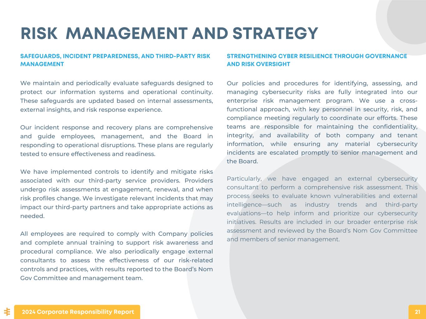 RISK MANAGEMENT AND STRATEGY STRENGTHENING CYBER RESILIENCE THROUGH GOVERNANCE AND RISK OVERSIGHT Our policies and procedures for identifying, assessing, and managing cybersecurity risks are fully integrated into our enterprise risk management program. We use a cross- functional approach, with key personnel in security, risk, and compliance meeting regularly to coordinate our efforts. These teams are responsible for maintaining the confidentiality, integrity, and availability of both company and tenant information, while ensuring any material cybersecurity incidents are escalated promptly to senior management and the Board. Particularly, we have engaged an external cybersecurity consultant to perform a comprehensive risk assessment. This process seeks to evaluate known vulnerabilities and external intelligence—such as industry trends and third-party evaluations—to help inform and prioritize our cybersecurity initiatives. Results are included in our broader enterprise risk assessment and reviewed by the Board’s Nom Gov Committee and members of senior management. 2024 Corporate Responsibility Report 21 SAFEGUARDS, INCIDENT PREPAREDNESS, AND THIRD-PARTY RISK MANAGEMENT We maintain and periodically evaluate safeguards designed to protect our information systems and operational continuity. These safeguards are updated based on internal assessments, external insights, and risk response experience. Our incident response and recovery plans are comprehensive and guide employees, management, and the Board in responding to operational disruptions. These plans are regularly tested to ensure effectiveness and readiness. We have implemented controls to identify and mitigate risks associated with our third-party service providers. Providers undergo risk assessments at engagement, renewal, and when risk profiles change. We investigate relevant incidents that may impact our third-party partners and take appropriate actions as needed. All employees are required to comply with Company policies and complete annual training to support risk awareness and procedural compliance. We also periodically engage external consultants to assess the effectiveness of our risk-related controls and practices, with results reported to the Board’s Nom Gov Committee and management team.