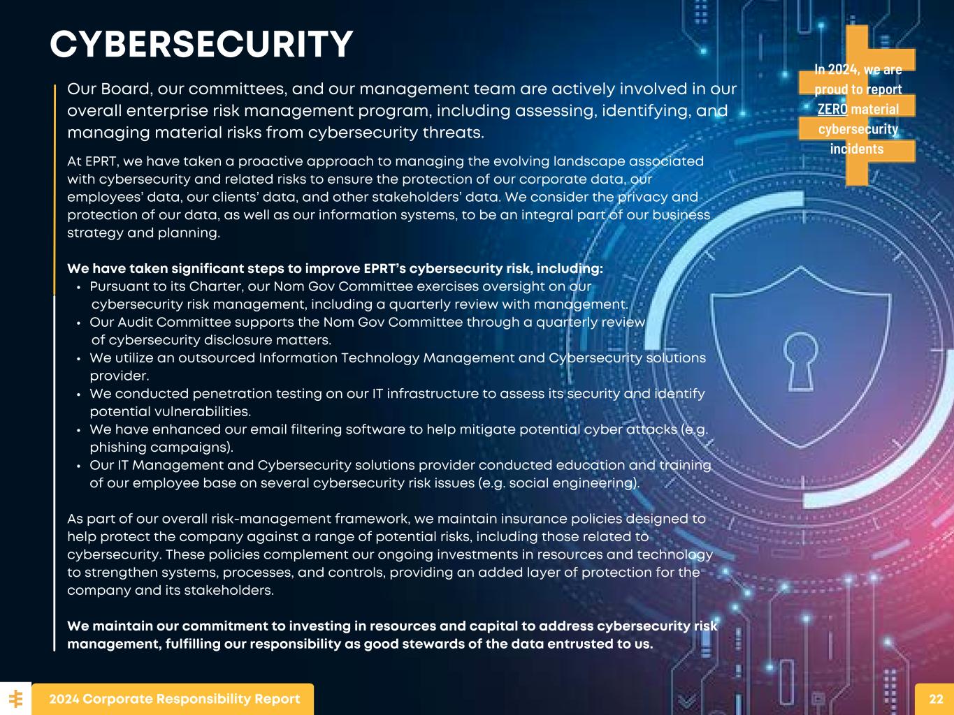 At EPRT, we have taken a proactive approach to managing the evolving landscape associated with cybersecurity and related risks to ensure the protection of our corporate data, our employees’ data, our clients’ data, and other stakeholders’ data. We consider the privacy and protection of our data, as well as our information systems, to be an integral part of our business strategy and planning. We have taken significant steps to improve EPRT’s cybersecurity risk, including: Pursuant to its Charter, our Nom Gov Committee exercises oversight on our cybersecurity risk management, including a quarterly review with management. Our Audit Committee supports the Nom Gov Committee through a quarterly review of cybersecurity disclosure matters. We utilize an outsourced Information Technology Management and Cybersecurity solutions provider. We conducted penetration testing on our IT infrastructure to assess its security and identify potential vulnerabilities. We have enhanced our email filtering software to help mitigate potential cyber attacks (e.g. phishing campaigns). Our IT Management and Cybersecurity solutions provider conducted education and training of our employee base on several cybersecurity risk issues (e.g. social engineering). As part of our overall risk-management framework, we maintain insurance policies designed to help protect the company against a range of potential risks, including those related to cybersecurity. These policies complement our ongoing investments in resources and technology to strengthen systems, processes, and controls, providing an added layer of protection for the company and its stakeholders. We maintain our commitment to investing in resources and capital to address cybersecurity risk management, fulfilling our responsibility as good stewards of the data entrusted to us. CYBERSECURITY In 2024, we are proud to report ZERO material cybersecurity incidents Our Board, our committees, and our management team are actively involved in our overall enterprise risk management program, including assessing, identifying, and managing material risks from cybersecurity threats. 2024 Corporate Responsibility Report 22