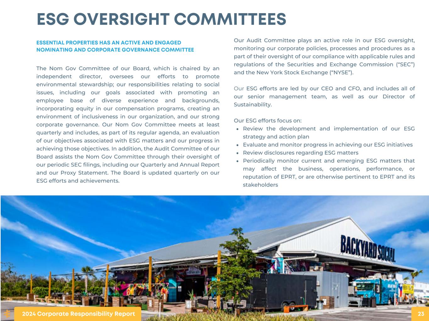 ESG OVERSIGHT COMMITTEES ESSENTIAL PROPERTIES HAS AN ACTIVE AND ENGAGED NOMINATING AND CORPORATE GOVERNANCE COMMITTEE The Nom Gov Committee of our Board, which is chaired by an independent director, oversees our efforts to promote environmental stewardship; our responsibilities relating to social issues, including our goals associated with promoting an employee base of diverse experience and backgrounds, incorporating equity in our compensation programs, creating an environment of inclusiveness in our organization, and our strong corporate governance. Our Nom Gov Committee meets at least quarterly and includes, as part of its regular agenda, an evaluation of our objectives associated with ESG matters and our progress in achieving those objectives. In addition, the Audit Committee of our Board assists the Nom Gov Committee through their oversight of our periodic SEC filings, including our Quarterly and Annual Report and our Proxy Statement. The Board is updated quarterly on our ESG efforts and achievements. Our Audit Committee plays an active role in our ESG oversight, monitoring our corporate policies, processes and procedures as a part of their oversight of our compliance with applicable rules and regulations of the Securities and Exchange Commission (“SEC”) and the New York Stock Exchange (“NYSE”). Our ESG efforts are led by our CEO and CFO, and includes all of our senior management team, as well as our Director of Sustainability. Our ESG efforts focus on: Review the development and implementation of our ESG strategy and action plan Evaluate and monitor progress in achieving our ESG initiatives Review disclosures regarding ESG matters Periodically monitor current and emerging ESG matters that may affect the business, operations, performance, or reputation of EPRT, or are otherwise pertinent to EPRT and its stakeholders 2024 Corporate Responsibility Report 23