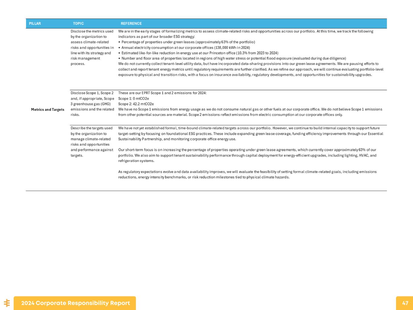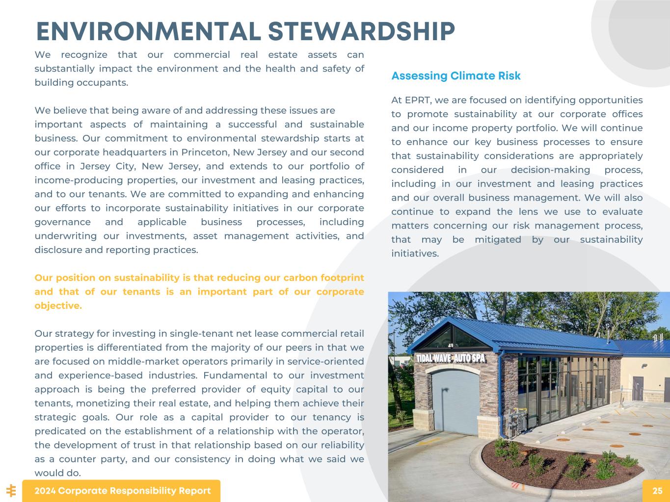 ENVIRONMENTAL STEWARDSHIP We recognize that our commercial real estate assets can substantially impact the environment and the health and safety of building occupants. We believe that being aware of and addressing these issues are important aspects of maintaining a successful and sustainable business. Our commitment to environmental stewardship starts at our corporate headquarters in Princeton, New Jersey and our second office in Jersey City, New Jersey, and extends to our portfolio of income-producing properties, our investment and leasing practices, and to our tenants. We are committed to expanding and enhancing our efforts to incorporate sustainability initiatives in our corporate governance and applicable business processes, including underwriting our investments, asset management activities, and disclosure and reporting practices. Our position on sustainability is that reducing our carbon footprint and that of our tenants is an important part of our corporate objective. Our strategy for investing in single-tenant net lease commercial retail properties is differentiated from the majority of our peers in that we are focused on middle-market operators primarily in service-oriented and experience-based industries. Fundamental to our investment approach is being the preferred provider of equity capital to our tenants, monetizing their real estate, and helping them achieve their strategic goals. Our role as a capital provider to our tenancy is predicated on the establishment of a relationship with the operator, the development of trust in that relationship based on our reliability as a counter party, and our consistency in doing what we said we would do. Assessing Climate Risk At EPRT, we are focused on identifying opportunities to promote sustainability at our corporate offices and our income property portfolio. We will continue to enhance our key business processes to ensure that sustainability considerations are appropriately considered in our decision-making process, including in our investment and leasing practices and our overall business management. We will also continue to expand the lens we use to evaluate matters concerning our risk management process, that may be mitigated by our sustainability initiatives. 2024 Corporate Responsibility Report 25