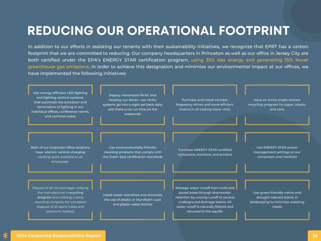 REDUCING OUR OPERATIONAL FOOTPRINT In addition to our efforts in assisting our tenants with their sustainability initiatives, we recognize that EPRT has a carbon footprint that we are committed to reducing. Our company headquarters in Princeton as well as our office in Jersey City are both certified under the EPA’s ENERGY STAR certification program, using 35% less energy and generating 35% fewer greenhouse gas emissions. In order to achieve this designation and minimize our environmental impact at our offices, we have implemented the following initiatives: Use energy efficient LED lighting and lighting control systems that automate the activation and termination of lighting in our individual offices, conference rooms, and common areas Deploy minimized HVAC and heating run times—our HVAC systems go into a night set back daily and there is no run time on the weekends Purchase and install variable frequency drives and more efficient motors in all cooling tower units Have an active single-stream recycling program for paper, plastic, and cans Both of our corporate office locations have electric vehicle charging parking spots available to all employees Use environmentally-friendly cleaning products that comply with the Green Seal certification standards Purchase ENERGY STAR certified computers, monitors, and printers Use ENERGY STAR power management settings on our computers and monitors Dispose of all ink cartridges utilizing the manufacturer’s recycling program and utilizing a lamp recycling company for compliant disposal of all spent tubes and electronic ballasts Install water machines and eliminate the use of plastic or Styrofoam cups and plastic water bottles Manage water runoff from roofs and paved areas through stormwater retention by routing runoff to various underground drainage basins. All water runoff is naturally filtered and returned to the aquifer Use green-friendly native and drought-tolerant plants in landscaping to minimize watering needs 2024 Corporate Responsibility Report 26