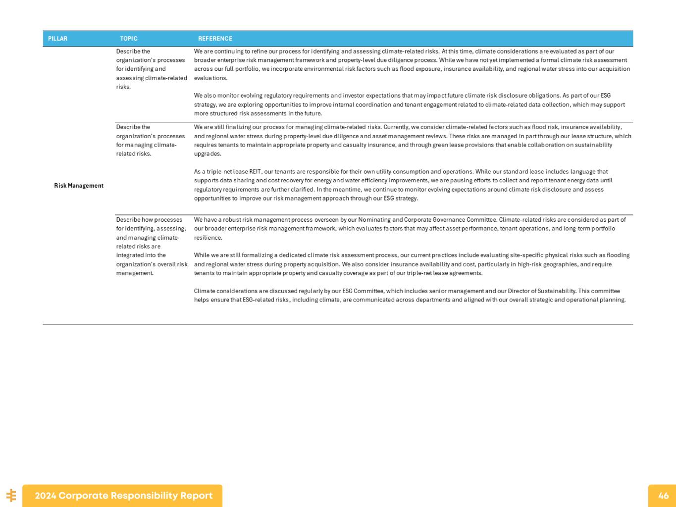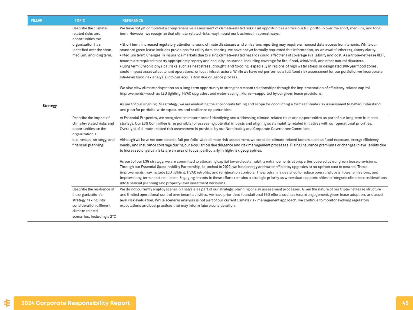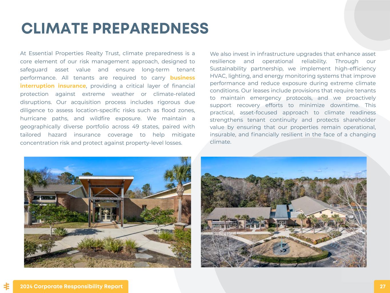 CLIMATE PREPAREDNESS At Essential Properties Realty Trust, climate preparedness is a core element of our risk management approach, designed to safeguard asset value and ensure long-term tenant performance. All tenants are required to carry business interruption insurance, providing a critical layer of financial protection against extreme weather or climate-related disruptions. Our acquisition process includes rigorous due diligence to assess location-specific risks such as flood zones, hurricane paths, and wildfire exposure. We maintain a geographically diverse portfolio across 49 states, paired with tailored hazard insurance coverage to help mitigate concentration risk and protect against property-level losses. 2024 Corporate Responsibility Report 27 We also invest in infrastructure upgrades that enhance asset resilience and operational reliability. Through our Sustainability partnership, we implement high-efficiency HVAC, lighting, and energy monitoring systems that improve performance and reduce exposure during extreme climate conditions. Our leases include provisions that require tenants to maintain emergency protocols, and we proactively support recovery efforts to minimize downtime. This practical, asset-focused approach to climate readiness strengthens tenant continuity and protects shareholder value by ensuring that our properties remain operational, insurable, and financially resilient in the face of a changing climate.