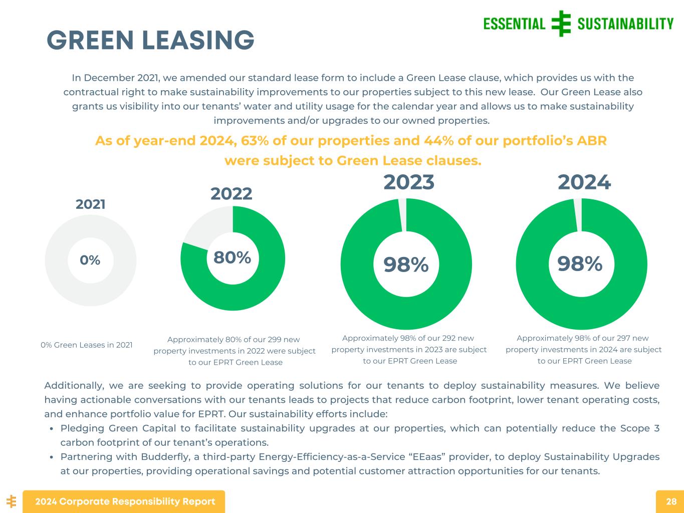 Additionally, we are seeking to provide operating solutions for our tenants to deploy sustainability measures. We believe having actionable conversations with our tenants leads to projects that reduce carbon footprint, lower tenant operating costs, and enhance portfolio value for EPRT. Our sustainability efforts include: Pledging Green Capital to facilitate sustainability upgrades at our properties, which can potentially reduce the Scope 3 carbon footprint of our tenant’s operations. Partnering with Budderfly, a third-party Energy-Efficiency-as-a-Service “EEaas” provider, to deploy Sustainability Upgrades at our properties, providing operational savings and potential customer attraction opportunities for our tenants. In December 2021, we amended our standard lease form to include a Green Lease clause, which provides us with the contractual right to make sustainability improvements to our properties subject to this new lease. Our Green Lease also grants us visibility into our tenants’ water and utility usage for the calendar year and allows us to make sustainability improvements and/or upgrades to our owned properties. As of year-end 2024, 63% of our properties and 44% of our portfolio’s ABR were subject to Green Lease clauses. 98% GREEN LEASING Approximately 98% of our 292 new property investments in 2023 are subject to our EPRT Green Lease 2023 0% 2021 80% Approximately 80% of our 299 new property investments in 2022 were subject to our EPRT Green Lease 2022 0% Green Leases in 2021 2024 Corporate Responsibility Report 28 98% Approximately 98% of our 297 new property investments in 2024 are subject to our EPRT Green Lease 2024