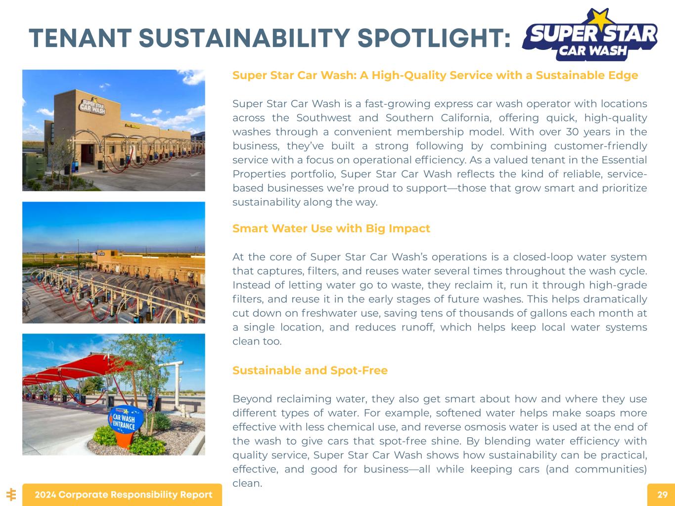 TENANT SUSTAINABILITY SPOTLIGHT: 2024 Corporate Responsibility Report 29 Super Star Car Wash: A High-Quality Service with a Sustainable Edge Super Star Car Wash is a fast-growing express car wash operator with locations across the Southwest and Southern California, offering quick, high-quality washes through a convenient membership model. With over 30 years in the business, they’ve built a strong following by combining customer-friendly service with a focus on operational efficiency. As a valued tenant in the Essential Properties portfolio, Super Star Car Wash reflects the kind of reliable, service- based businesses we’re proud to support—those that grow smart and prioritize sustainability along the way. Smart Water Use with Big Impact At the core of Super Star Car Wash’s operations is a closed-loop water system that captures, filters, and reuses water several times throughout the wash cycle. Instead of letting water go to waste, they reclaim it, run it through high-grade filters, and reuse it in the early stages of future washes. This helps dramatically cut down on freshwater use, saving tens of thousands of gallons each month at a single location, and reduces runoff, which helps keep local water systems clean too. Sustainable and Spot-Free Beyond reclaiming water, they also get smart about how and where they use different types of water. For example, softened water helps make soaps more effective with less chemical use, and reverse osmosis water is used at the end of the wash to give cars that spot-free shine. By blending water efficiency with quality service, Super Star Car Wash shows how sustainability can be practical, effective, and good for business—all while keeping cars (and communities) clean.