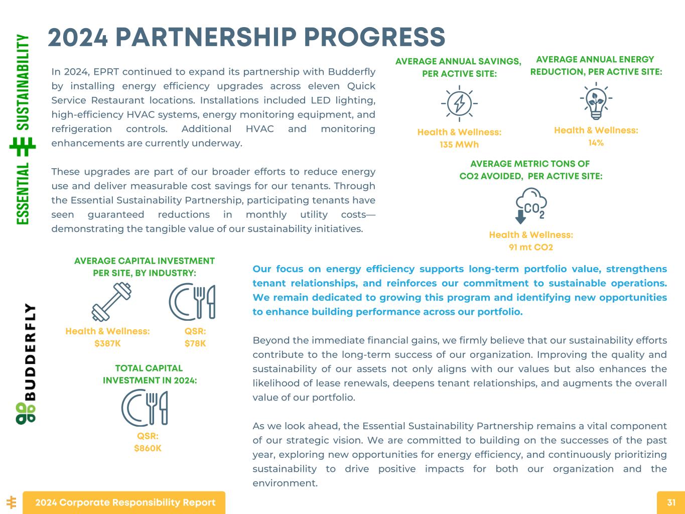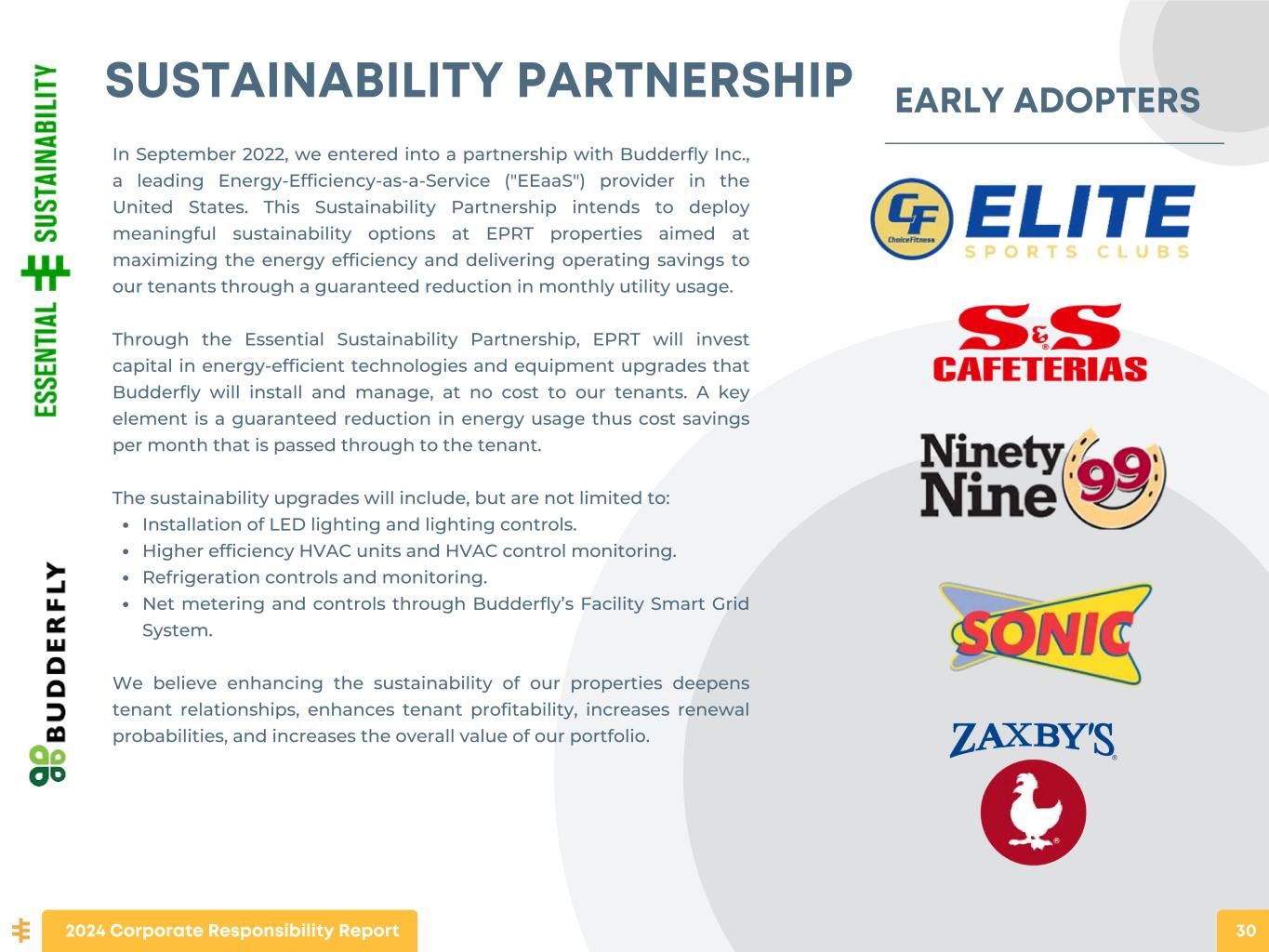 EARLY ADOPTERS In September 2022, we entered into a partnership with Budderfly Inc., a leading Energy-Efficiency-as-a-Service ("EEaaS") provider in the United States. This Sustainability Partnership intends to deploy meaningful sustainability options at EPRT properties aimed at maximizing the energy efficiency and delivering operating savings to our tenants through a guaranteed reduction in monthly utility usage. Through the Essential Sustainability Partnership, EPRT will invest capital in energy-efficient technologies and equipment upgrades that Budderfly will install and manage, at no cost to our tenants. A key element is a guaranteed reduction in energy usage thus cost savings per month that is passed through to the tenant. The sustainability upgrades will include, but are not limited to: Installation of LED lighting and lighting controls. Higher efficiency HVAC units and HVAC control monitoring. Refrigeration controls and monitoring. Net metering and controls through Budderfly’s Facility Smart Grid System. We believe enhancing the sustainability of our properties deepens tenant relationships, enhances tenant profitability, increases renewal probabilities, and increases the overall value of our portfolio. SUSTAINABILITY PARTNERSHIP 2024 Corporate Responsibility Report 30