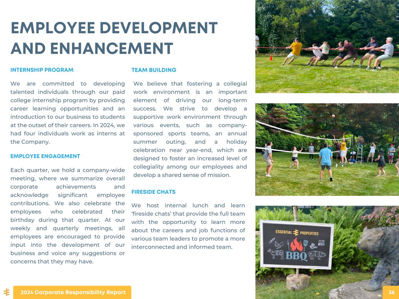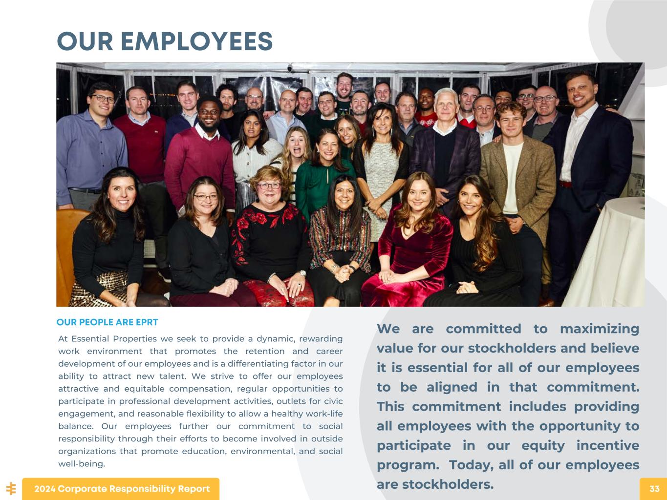 OUR EMPLOYEES OUR PEOPLE ARE EPRT At Essential Properties we seek to provide a dynamic, rewarding work environment that promotes the retention and career development of our employees and is a differentiating factor in our ability to attract new talent. We strive to offer our employees attractive and equitable compensation, regular opportunities to participate in professional development activities, outlets for civic engagement, and reasonable flexibility to allow a healthy work-life balance. Our employees further our commitment to social responsibility through their efforts to become involved in outside organizations that promote education, environmental, and social well-being. We are committed to maximizing value for our stockholders and believe it is essential for all of our employees to be aligned in that commitment. This commitment includes providing all employees with the opportunity to participate in our equity incentive program. Today, all of our employees are stockholders.2024 Corporate Responsibility Report 33