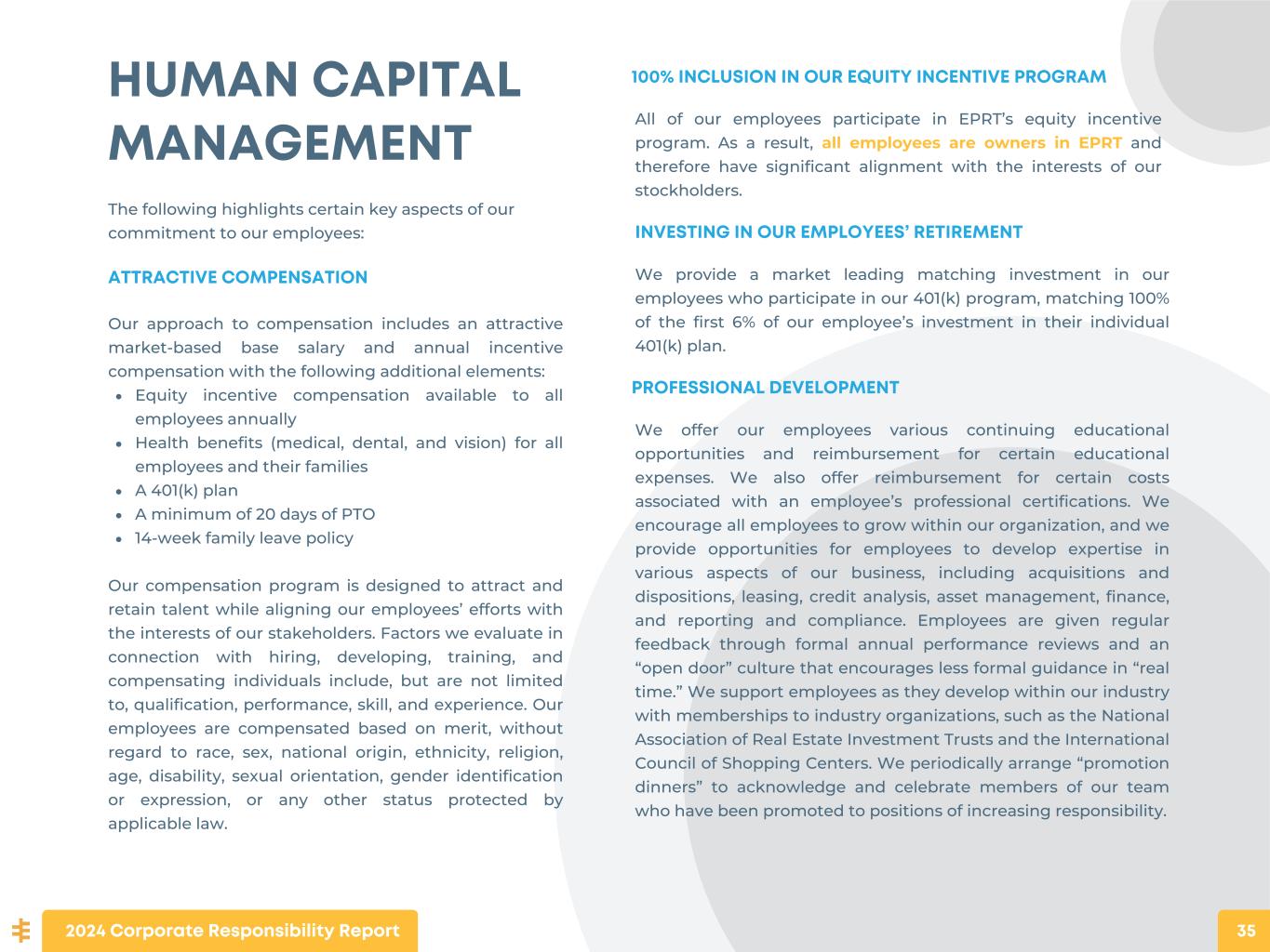 HUMAN CAPITAL MANAGEMENT The following highlights certain key aspects of our commitment to our employees: ATTRACTIVE COMPENSATION Our approach to compensation includes an attractive market-based base salary and annual incentive compensation with the following additional elements: Equity incentive compensation available to all employees annually Health benefits (medical, dental, and vision) for all employees and their families A 401(k) plan A minimum of 20 days of PTO 14-week family leave policy Our compensation program is designed to attract and retain talent while aligning our employees’ efforts with the interests of our stakeholders. Factors we evaluate in connection with hiring, developing, training, and compensating individuals include, but are not limited to, qualification, performance, skill, and experience. Our employees are compensated based on merit, without regard to race, sex, national origin, ethnicity, religion, age, disability, sexual orientation, gender identification or expression, or any other status protected by applicable law. 100% INCLUSION IN OUR EQUITY INCENTIVE PROGRAM All of our employees participate in EPRT’s equity incentive program. As a result, all employees are owners in EPRT and therefore have significant alignment with the interests of our stockholders. INVESTING IN OUR EMPLOYEES’ RETIREMENT We provide a market leading matching investment in our employees who participate in our 401(k) program, matching 100% of the first 6% of our employee’s investment in their individual 401(k) plan. PROFESSIONAL DEVELOPMENT We offer our employees various continuing educational opportunities and reimbursement for certain educational expenses. We also offer reimbursement for certain costs associated with an employee’s professional certifications. We encourage all employees to grow within our organization, and we provide opportunities for employees to develop expertise in various aspects of our business, including acquisitions and dispositions, leasing, credit analysis, asset management, finance, and reporting and compliance. Employees are given regular feedback through formal annual performance reviews and an “open door” culture that encourages less formal guidance in “real time.” We support employees as they develop within our industry with memberships to industry organizations, such as the National Association of Real Estate Investment Trusts and the International Council of Shopping Centers. We periodically arrange “promotion dinners” to acknowledge and celebrate members of our team who have been promoted to positions of increasing responsibility. 2024 Corporate Responsibility Report 35
