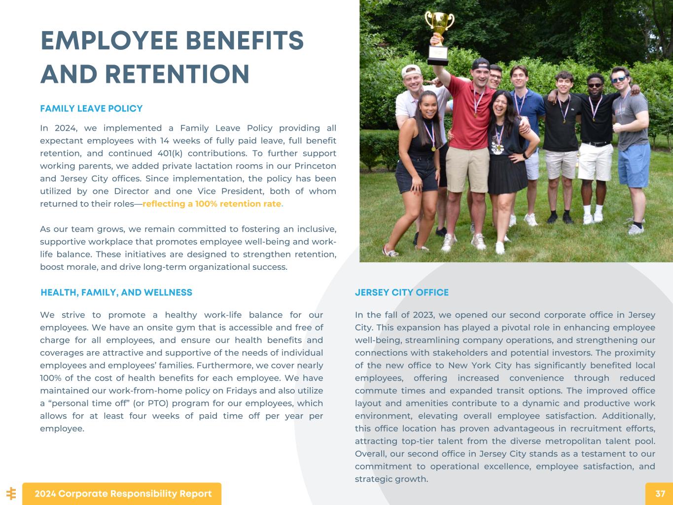 EMPLOYEE BENEFITS AND RETENTION FAMILY LEAVE POLICY In 2024, we implemented a Family Leave Policy providing all expectant employees with 14 weeks of fully paid leave, full benefit retention, and continued 401(k) contributions. To further support working parents, we added private lactation rooms in our Princeton and Jersey City offices. Since implementation, the policy has been utilized by one Director and one Vice President, both of whom returned to their roles—reflecting a 100% retention rate. As our team grows, we remain committed to fostering an inclusive, supportive workplace that promotes employee well-being and work- life balance. These initiatives are designed to strengthen retention, boost morale, and drive long-term organizational success. JERSEY CITY OFFICE In the fall of 2023, we opened our second corporate office in Jersey City. This expansion has played a pivotal role in enhancing employee well-being, streamlining company operations, and strengthening our connections with stakeholders and potential investors. The proximity of the new office to New York City has significantly benefited local employees, offering increased convenience through reduced commute times and expanded transit options. The improved office layout and amenities contribute to a dynamic and productive work environment, elevating overall employee satisfaction. Additionally, this office location has proven advantageous in recruitment efforts, attracting top-tier talent from the diverse metropolitan talent pool. Overall, our second office in Jersey City stands as a testament to our commitment to operational excellence, employee satisfaction, and strategic growth. 2024 Corporate Responsibility Report 37 HEALTH, FAMILY, AND WELLNESS We strive to promote a healthy work-life balance for our employees. We have an onsite gym that is accessible and free of charge for all employees, and ensure our health benefits and coverages are attractive and supportive of the needs of individual employees and employees’ families. Furthermore, we cover nearly 100% of the cost of health benefits for each employee. We have maintained our work-from-home policy on Fridays and also utilize a “personal time off” (or PTO) program for our employees, which allows for at least four weeks of paid time off per year per employee.