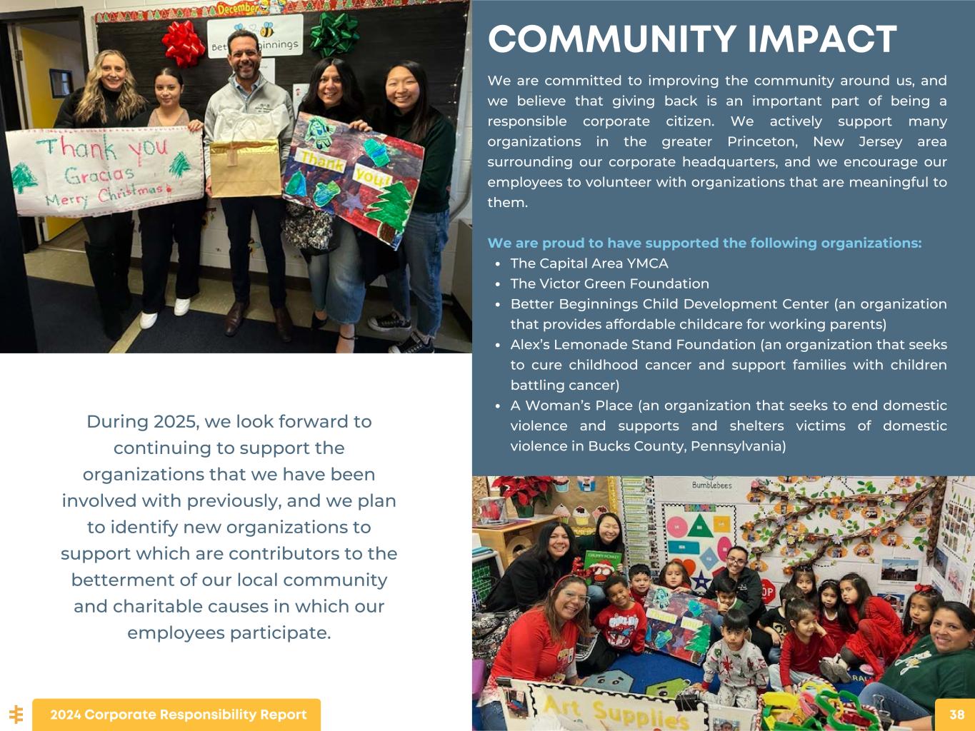 COMMUNITY IMPACT We are committed to improving the community around us, and we believe that giving back is an important part of being a responsible corporate citizen. We actively support many organizations in the greater Princeton, New Jersey area surrounding our corporate headquarters, and we encourage our employees to volunteer with organizations that are meaningful to them. We are proud to have supported the following organizations: The Capital Area YMCA The Victor Green Foundation Better Beginnings Child Development Center (an organization that provides affordable childcare for working parents) Alex’s Lemonade Stand Foundation (an organization that seeks to cure childhood cancer and support families with children battling cancer) A Woman’s Place (an organization that seeks to end domestic violence and supports and shelters victims of domestic violence in Bucks County, Pennsylvania) During 2025, we look forward to continuing to support the organizations that we have been involved with previously, and we plan to identify new organizations to support which are contributors to the betterment of our local community and charitable causes in which our employees participate. 2024 Corporate Responsibility Report 38
