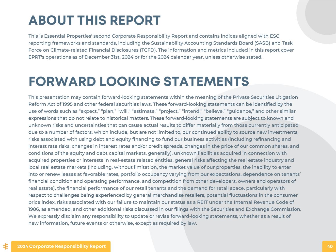 ABOUT THIS REPORT This is Essential Properties' second Corporate Responsibility Report and contains indices aligned with ESG reporting frameworks and standards, including the Sustainability Accounting Standards Board (SASB) and Task Force on Climate-related Financial Disclosures (TCFD). The information and metrics included in this report cover EPRT's operations as of December 31st, 2024 or for the 2024 calendar year, unless otherwise stated. FORWARD LOOKING STATEMENTS This presentation may contain forward-looking statements within the meaning of the Private Securities Litigation Reform Act of 1995 and other federal securities laws. These forward-looking statements can be identified by the use of words such as “expect,” “plan,” "will," “estimate,” “project,” “intend,” “believe,” “guidance,” and other similar expressions that do not relate to historical matters. These forward-looking statements are subject to known and unknown risks and uncertainties that can cause actual results to differ materially from those currently anticipated due to a number of factors, which include, but are not limited to, our continued ability to source new investments, risks associated with using debt and equity financing to fund our business activities (including refinancing and interest rate risks, changes in interest rates and/or credit spreads, changes in the price of our common shares, and conditions of the equity and debt capital markets, generally), unknown liabilities acquired in connection with acquired properties or interests in real-estate related entities, general risks affecting the real estate industry and local real estate markets (including, without limitation, the market value of our properties, the inability to enter into or renew leases at favorable rates, portfolio occupancy varying from our expectations, dependence on tenants’ financial condition and operating performance, and competition from other developers, owners and operators of real estate), the financial performance of our retail tenants and the demand for retail space, particularly with respect to challenges being experienced by general merchandise retailers, potential fluctuations in the consumer price index, risks associated with our failure to maintain our status as a REIT under the Internal Revenue Code of 1986, as amended, and other additional risks discussed in our filings with the Securities and Exchange Commission. We expressly disclaim any responsibility to update or revise forward-looking statements, whether as a result of new information, future events or otherwise, except as required by law. 2024 Corporate Responsibility Report 40