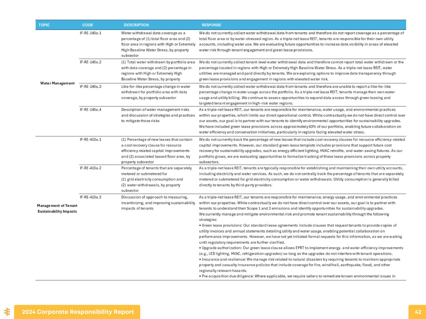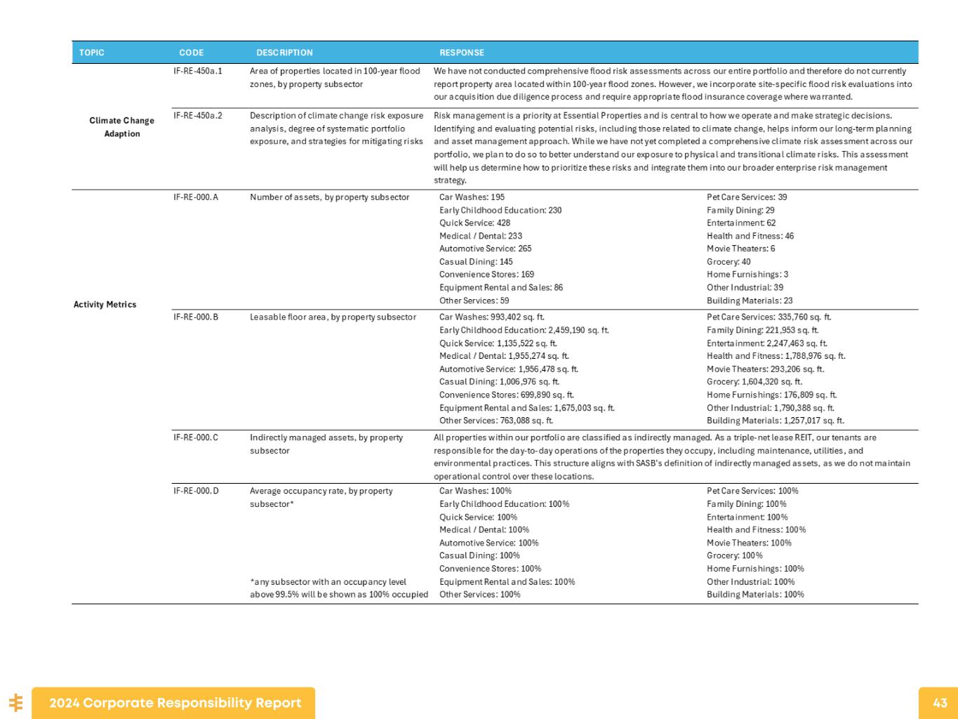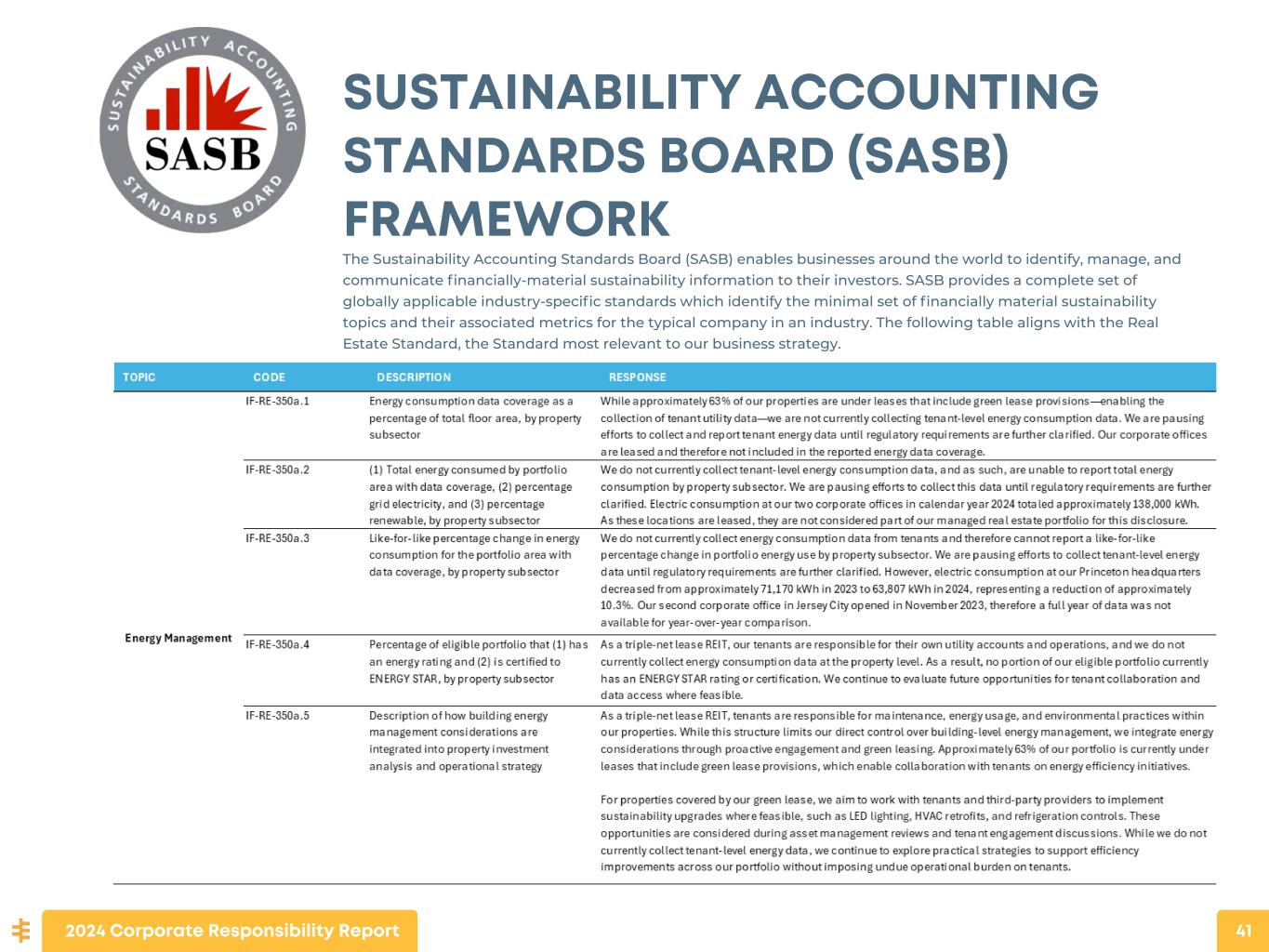 SUSTAINABILITY ACCOUNTING STANDARDS BOARD (SASB) FRAMEWORK The Sustainability Accounting Standards Board (SASB) enables businesses around the world to identify, manage, and communicate financially-material sustainability information to their investors. SASB provides a complete set of globally applicable industry-specific standards which identify the minimal set of financially material sustainability topics and their associated metrics for the typical company in an industry. The following table aligns with the Real Estate Standard, the Standard most relevant to our business strategy. 2024 Corporate Responsibility Report 41