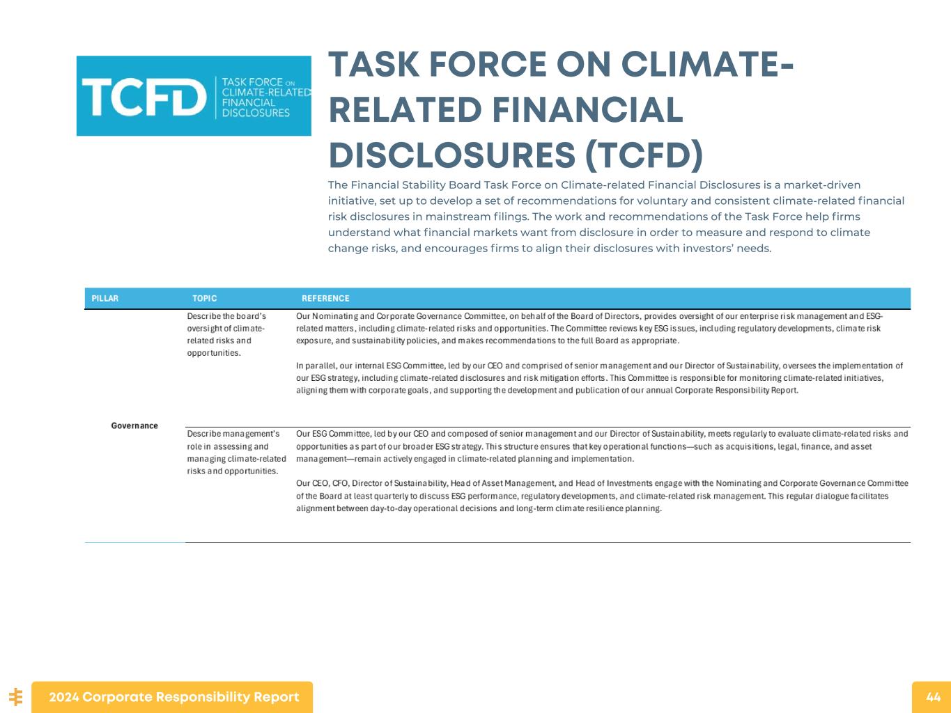 The Financial Stability Board Task Force on Climate-related Financial Disclosures is a market-driven initiative, set up to develop a set of recommendations for voluntary and consistent climate-related financial risk disclosures in mainstream filings. The work and recommendations of the Task Force help firms understand what financial markets want from disclosure in order to measure and respond to climate change risks, and encourages firms to align their disclosures with investors’ needs. TASK FORCE ON CLIMATE- RELATED FINANCIAL DISCLOSURES (TCFD) 2024 Corporate Responsibility Report 44