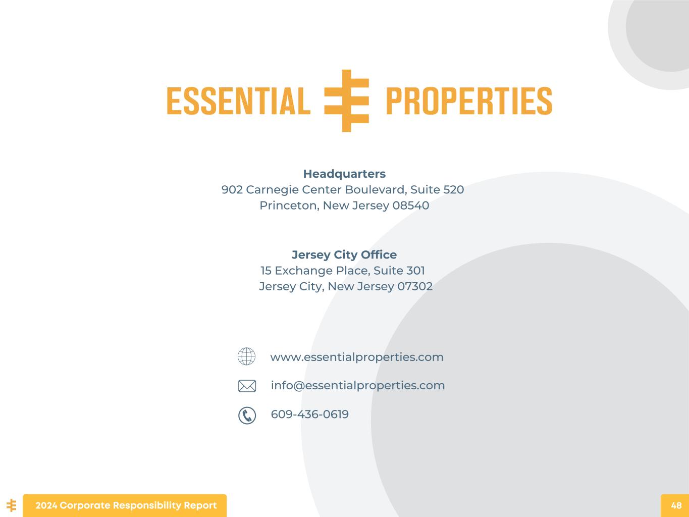 Headquarters 902 Carnegie Center Boulevard, Suite 520 Princeton, New Jersey 08540 Jersey City Office 15 Exchange Place, Suite 301 Jersey City, New Jersey 07302 info@essentialproperties.com 609-436-0619 www.essentialproperties.com 2024 Corporate Responsibility Report 48