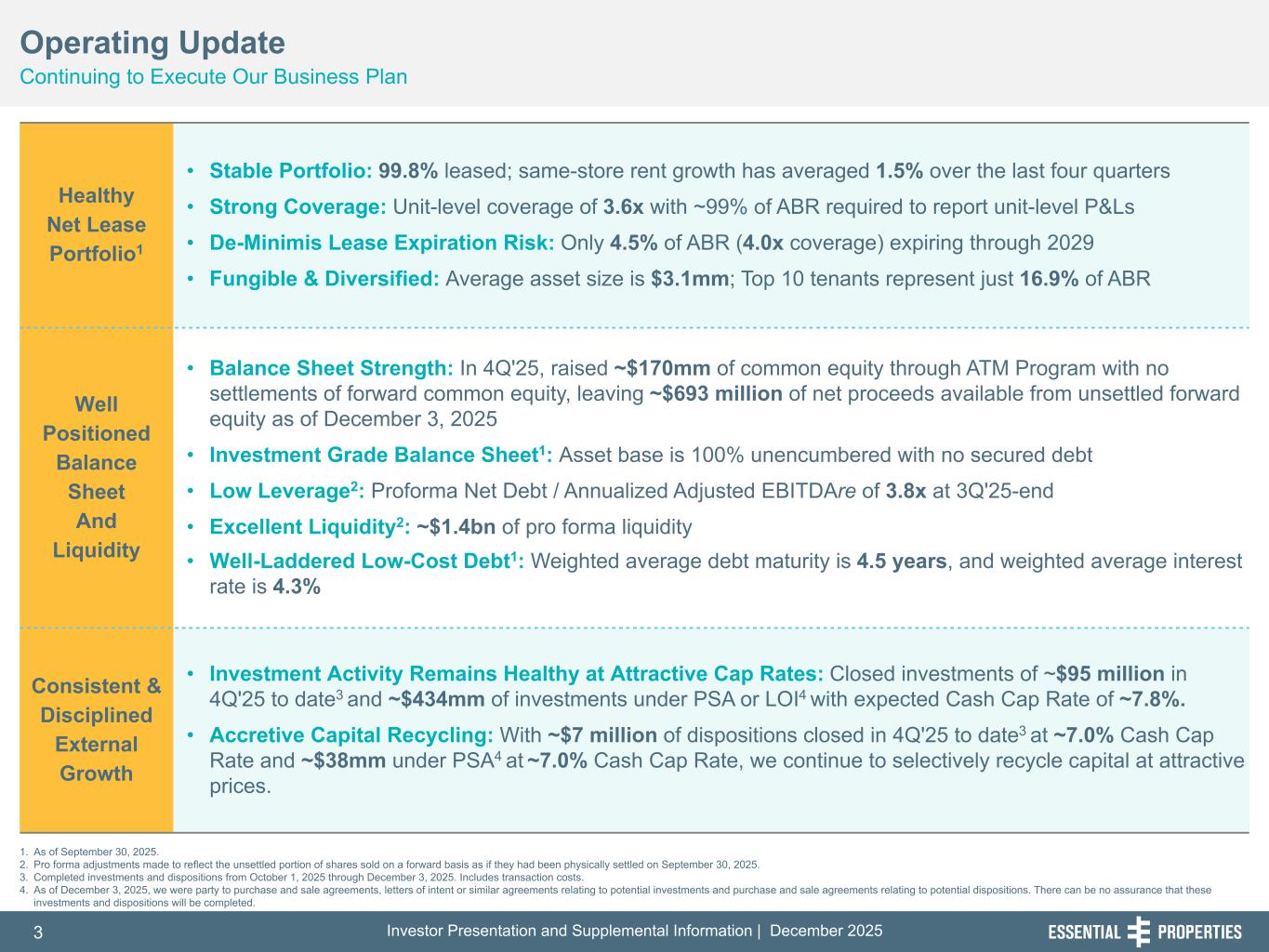 Investor Presentation and Supplemental Information | December 20253 254, 192, 59 75, 108, 127 146, 204, 238 0, 0, 0 38, 169, 224 153, 223, 227 Healthy Net Lease Portfolio1 • Stable Portfolio: 99.8% leased; same-store rent growth has averaged 1.5% over the last four quarters • Strong Coverage: Unit-level coverage of 3.6x with ~99% of ABR required to report unit-level P&Ls • De-Minimis Lease Expiration Risk: Only 4.5% of ABR (4.0x coverage) expiring through 2029 • Fungible & Diversified: Average asset size is $3.1mm; Top 10 tenants represent just 16.9% of ABR Well Positioned Balance Sheet And Liquidity • Balance Sheet Strength: In 4Q'25, raised ~$170mm of common equity through ATM Program with no settlements of forward common equity, leaving ~$693 million of net proceeds available from unsettled forward equity as of December 3, 2025 • Investment Grade Balance Sheet1: Asset base is 100% unencumbered with no secured debt • Low Leverage2: Proforma Net Debt / Annualized Adjusted EBITDAre of 3.8x at 3Q'25-end • Excellent Liquidity2: ~$1.4bn of pro forma liquidity • Well-Laddered Low-Cost Debt1: Weighted average debt maturity is 4.5 years, and weighted average interest rate is 4.3% Consistent & Disciplined External Growth • Investment Activity Remains Healthy at Attractive Cap Rates: Closed investments of ~$95 million in 4Q'25 to date3 and ~$434mm of investments under PSA or LOI4 with expected Cash Cap Rate of ~7.8%. • Accretive Capital Recycling: With ~$7 million of dispositions closed in 4Q'25 to date3 at ~7.0% Cash Cap Rate and ~$38mm under PSA4 at ~7.0% Cash Cap Rate, we continue to selectively recycle capital at attractive prices. 1. As of September 30, 2025. 2. Pro forma adjustments made to reflect the unsettled portion of shares sold on a forward basis as if they had been physically settled on September 30, 2025. 3. Completed investments and dispositions from October 1, 2025 through December 3, 2025. Includes transaction costs. 4. As of December 3, 2025, we were party to purchase and sale agreements, letters of intent or similar agreements relating to potential investments and purchase and sale agreements relating to potential dispositions. There can be no assurance that these investments and dispositions will be completed. Operating Update Continuing to Execute Our Business Plan