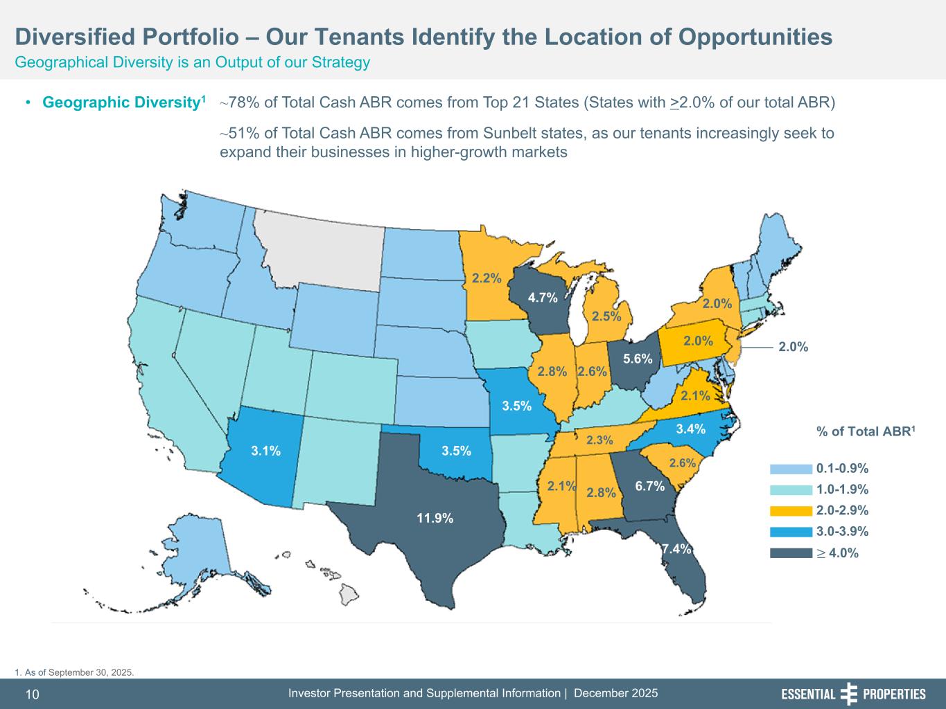 Investor Presentation and Supplemental Information | December 202510 254, 192, 59 75, 108, 127 146, 204, 238 0, 0, 0 38, 169, 224 153, 223, 227 Diversified Portfolio – Our Tenants Identify the Location of Opportunities Geographical Diversity is an Output of our Strategy • Geographic Diversity1 ~78% of Total Cash ABR comes from Top 21 States (States with >2.0% of our total ABR) ~51% of Total Cash ABR comes from Sunbelt states, as our tenants increasingly seek to expand their businesses in higher-growth markets % of Total ABR1 0.1-0.9% 1.0-1.9% 2.0-2.9% 3.0-3.9% ≥ 4.0% 2.0% 11.9% 3.1% 3.5% 2.2% 4.7% 2.5% 2.8% 3.5% 2.1% 5.6% 3.4% 6.7%2.8% 7.4% 2.3% 2.6% 2.6% 1. As of September 30, 2025. 2.0% 2.0% 2.1%