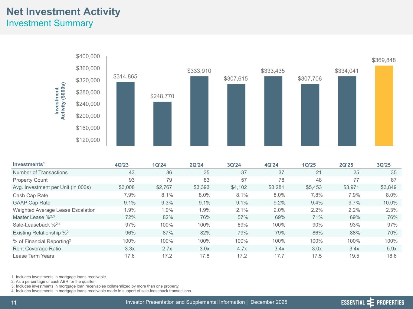 Investor Presentation and Supplemental Information | December 202511 254, 192, 59 75, 108, 127 146, 204, 238 0, 0, 0 38, 169, 224 153, 223, 227 Net Investment Activity Investment Summary 242, 242, 242 1. Includes investments in mortgage loans receivable. 2. As a percentage of cash ABR for the quarter. 3. Includes investments in mortgage loan receivables collateralized by more than one property. 4. Includes investments in mortgage loans receivable made in support of sale-leaseback transactions. Investments1 4Q'23 1Q'24 2Q'24 3Q'24 4Q'24 1Q'25 2Q'25 3Q'25 Number of Transactions 43 36 35 37 37 21 25 35 Property Count 93 79 83 57 78 48 77 87 Avg. Investment per Unit (in 000s) $3,008 $2,767 $3,393 $4,102 $3,281 $5,453 $3,971 $3,849 Cash Cap Rate 7.9 % 8.1 % 8.0 % 8.1 % 8.0 % 7.8 % 7.9 % 8.0 % GAAP Cap Rate 9.1 % 9.3 % 9.1 % 9.1 % 9.2 % 9.4 % 9.7 % 10.0 % Weighted Average Lease Escalation 1.9 % 1.8 % 1.9 % 1.8 % 1.9 % 1.8 % 2.1 % 2.0 % 2.2 % 2.2 % 2.3 % Master Lease %2,3 72 % 82 % 76 % 57 % 69 % 71 % 69 % 76 % Sale-Leaseback %2,4 97 % 100 % 100 % 89 % 100 % 90 % 93 % 97 % Existing Relationship %2 96 % 87 % 82 % 79 % 79 % 86 % 88 % 70 % % of Financial Reporting2 100 % 100 % 100 % 100 % 100 % 100 % 100 % 100 % Rent Coverage Ratio 3.3x 2.7x 3.0x 4.7x 3.4x 3.0x 3.4x 5.9x Lease Term Years 17.6 17.2 17.8 17.2 17.7 17.5 19.5 18.6 $314,865 $248,770 $333,910 $307,615 $333,435 $307,706 $334,041 $369,848 $120,000 $160,000 $200,000 $240,000 $280,000 $320,000 $360,000 $400,000 In ve st m en t A ct iv ity ($ 00 0s )