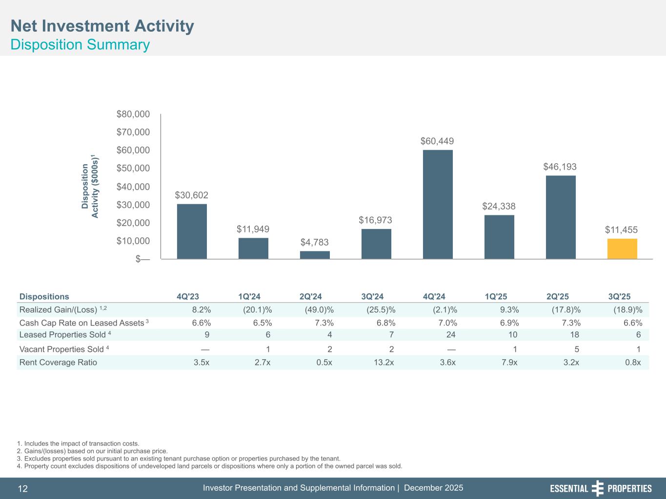 Investor Presentation and Supplemental Information | December 202512 254, 192, 59 75, 108, 127 146, 204, 238 0, 0, 0 38, 169, 224 153, 223, 227 Net Investment Activity Disposition Summary 242, 242, 242 1. Includes the impact of transaction costs. 2. Gains/(losses) based on our initial purchase price. 3. Excludes properties sold pursuant to an existing tenant purchase option or properties purchased by the tenant. 4. Property count excludes dispositions of undeveloped land parcels or dispositions where only a portion of the owned parcel was sold. Dispositions 4Q'23 1Q'24 2Q'24 3Q'24 4Q'24 1Q'25 2Q'25 3Q'25 Realized Gain/(Loss) 1,2 8.2 % (20.1) % (49.0) % (25.5) % (2.1) % 9.3 % (17.8) % (18.9) % Cash Cap Rate on Leased Assets 3 6.6 % 6.5 % 7.3 % 6.8 % 7.0 % 6.9 % 7.3 % 6.6 % Leased Properties Sold 4 9 6 4 7 24 10 18 6 Vacant Properties Sold 4 — 1 2 2 — 1 5 1 Rent Coverage Ratio 3.5x 2.7x 0.5x 13.2x 3.6x 7.9x 3.2x 0.8x $30,602 $11,949 $4,783 $16,973 $60,449 $24,338 $46,193 $11,455 $— $10,000 $20,000 $30,000 $40,000 $50,000 $60,000 $70,000 $80,000 D is po si tio n A ct iv ity ($ 00 0s )1