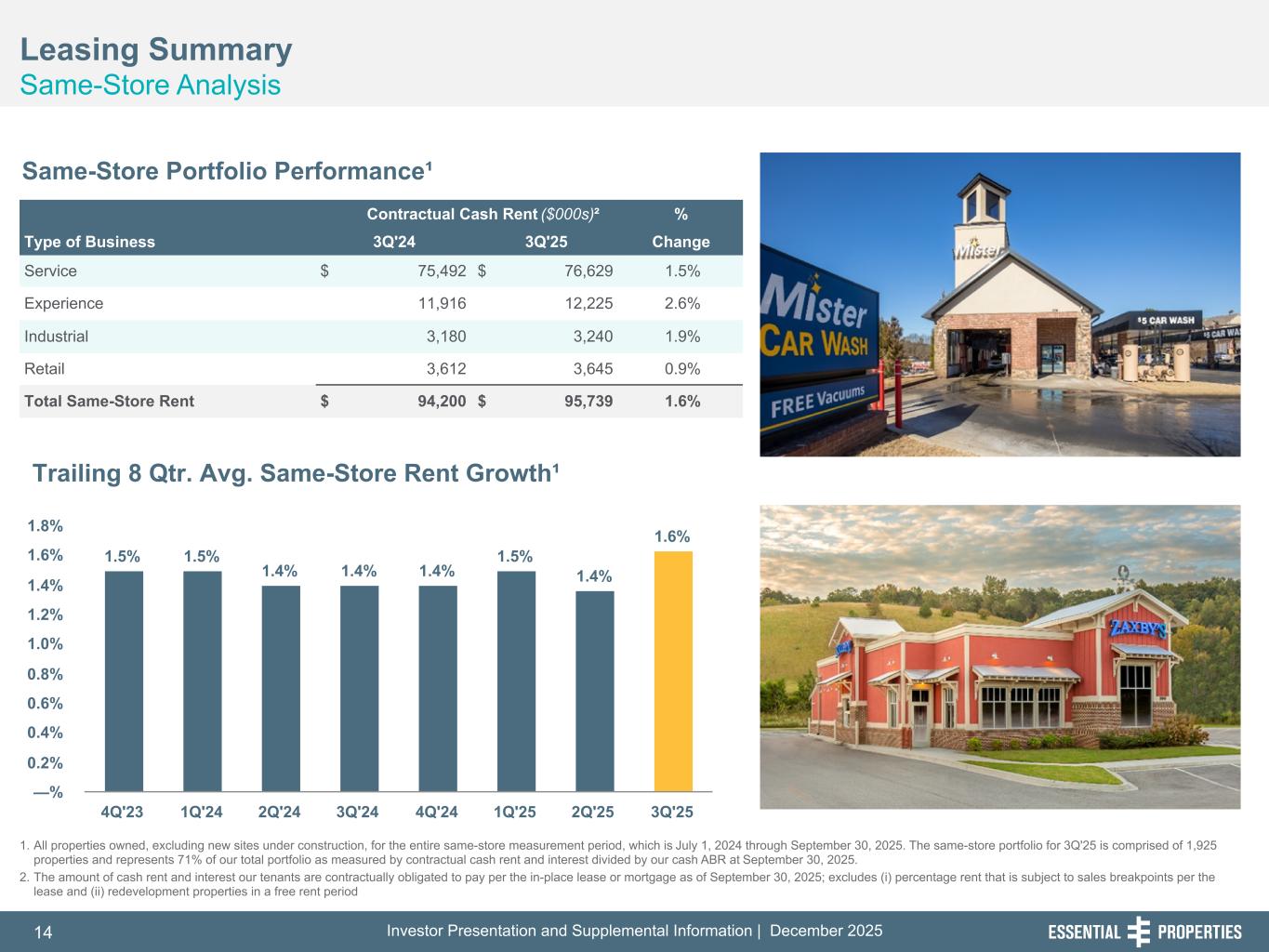 Investor Presentation and Supplemental Information | December 202514 254, 192, 59 75, 108, 127 146, 204, 238 0, 0, 0 38, 169, 224 153, 223, 227 Leasing Summary Same-Store Analysis 242, 242, 242 Same-Store Portfolio Performance¹ Contractual Cash Rent ($000s)² % Type of Business 3Q'24 3Q'25 Change Service $ 75,492 $ 76,629 1.5% Experience 11,916 12,225 2.6% Industrial 3,180 3,240 1.9% Retail 3,612 3,645 0.9% Total Same-Store Rent $ 94,200 $ 95,739 1.6% 1.5% 1.5% 1.4% 1.4% 1.4% 1.5% 1.4% 1.6% 4Q'23 1Q'24 2Q'24 3Q'24 4Q'24 1Q'25 2Q'25 3Q'25 —% 0.2% 0.4% 0.6% 0.8% 1.0% 1.2% 1.4% 1.6% 1.8% 1. All properties owned, excluding new sites under construction, for the entire same-store measurement period, which is July 1, 2024 through September 30, 2025. The same-store portfolio for 3Q'25 is comprised of 1,925 properties and represents 71% of our total portfolio as measured by contractual cash rent and interest divided by our cash ABR at September 30, 2025. 2. The amount of cash rent and interest our tenants are contractually obligated to pay per the in-place lease or mortgage as of September 30, 2025; excludes (i) percentage rent that is subject to sales breakpoints per the lease and (ii) redevelopment properties in a free rent period Trailing 8 Qtr. Avg. Same-Store Rent Growth¹