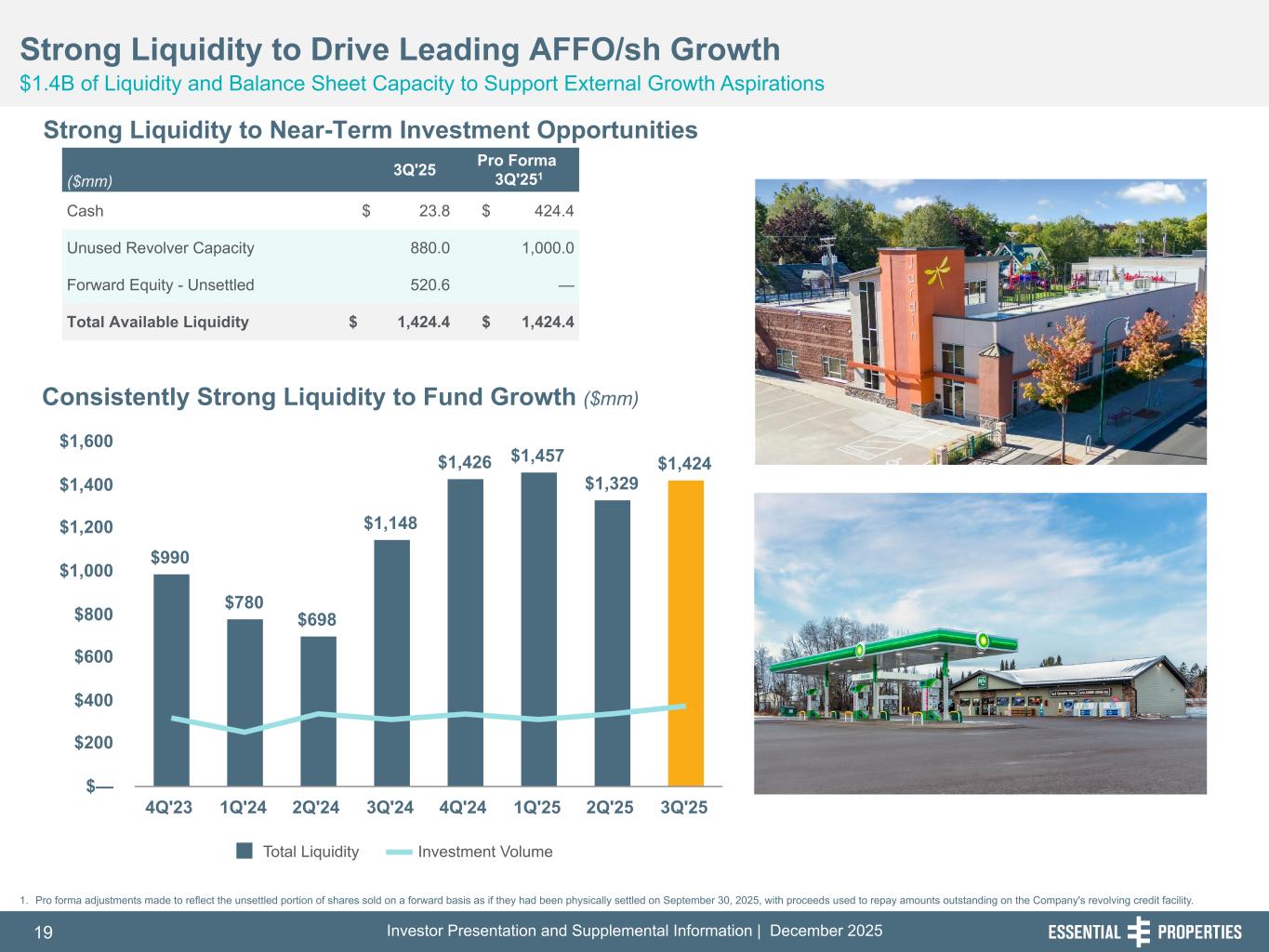 Investor Presentation and Supplemental Information | December 202519 254, 192, 59 75, 108, 127 146, 204, 238 0, 0, 0 38, 169, 224 153, 223, 227 Consistently Strong Liquidity to Fund Growth ($mm) Strong Liquidity to Drive Leading AFFO/sh Growth $1.4B of Liquidity and Balance Sheet Capacity to Support External Growth Aspirations 242, 242, 242 ($mm) 3Q'25 Pro Forma 3Q'251 Cash $ 23.8 $ 424.4 Unused Revolver Capacity 880.0 1,000.0 Forward Equity - Unsettled 520.6 — Total Available Liquidity $ 1,424.4 $ 1,424.4 1. Pro forma adjustments made to reflect the unsettled portion of shares sold on a forward basis as if they had been physically settled on September 30, 2025, with proceeds used to repay amounts outstanding on the Company's revolving credit facility. Strong Liquidity to Near-Term Investment Opportunities $990 $780 $698 $1,148 $1,426 $1,457 $1,329 $1,424 Total Liquidity Investment Volume 4Q'23 1Q'24 2Q'24 3Q'24 4Q'24 1Q'25 2Q'25 3Q'25 $— $200 $400 $600 $800 $1,000 $1,200 $1,400 $1,600