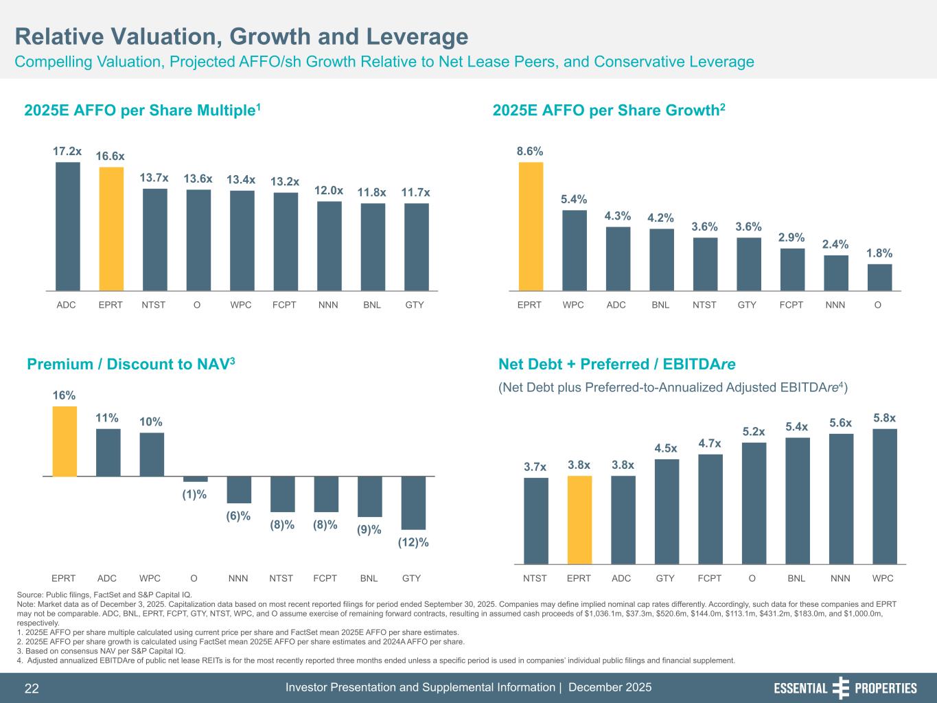 Investor Presentation and Supplemental Information | December 202521 254, 192, 59 75, 108, 127 146, 204, 238 0, 0, 0 38, 169, 224 153, 223, 227 Source: Public filings and press releases. Note: Data based on reported filings for period ending September 30, 2025, not adjusted for post quarter-end subsequent events. ‘NR’ means not reported. Companies may define service-oriented and experienced-based tenants differently, may calculate weighted average remaining lease term differently, may calculate unit-level coverage differently (including peers on a mean or median basis with EPRT representing a weighted average) and may calculate the percentage of their tenants reporting differently than EPRT. Accordingly, such data for these companies and EPRT may not be comparable. 1. Designations entitled “other” are counted as one industry, even though the “other” segment could represent multiple industries. 2. Investment value includes land and improvements, building and improvements, lease incentives, CIP, intangible lease assets, loans and direct financing lease receivables and real estate investments held for sale, all at cost. 3. EPRT and GTY coverage based on four-wall. Differentiated Net Lease Investment Opportunity Portfolio Mix and Underlying Fundamentals are Favorable Relative to Peers Strong Unit-Level Coverage3 & Transparency Service-Oriented & Experience-Based Industries Limited Intermediate-Term Lease Maturities 242, 242, 242 (% of ABR) (% of Rent Expiring through 2027) Less Reliance on Top 10 Tenancy – Fungible Properties (% of ABR) 17% 19% 21% 24% 30% 35% 38% 63% 63% EPRT WPC BNL O NNN ADC NTST GTY FCPT 99% 92% 87% 70% 39% 30% 27% 23% 8% GTY EPRT FCPT NNN O NTST ADC BNL WPC 5.1x 3.6x 3.2x 2.6x FCPT EPRT BNL GTY O ADC NNN NTST WPC Total Number of Tenant Industries1 % Unit-Level Financial Reporting Average Investment Per Property ($mm)2 Weighted Average Lease Term (# of Years) NR NR NR NR 2% 3% 7% 7% 7% 10% 10% 12% 13% EPRT NTST WPC GTY ADC BNL NNN O FCPT 6 18 4 37 92 28 32 56 27 $3.1 $12.3 $7.6 $4.5 $3.1 $3.8 $3.4 $2.0 $2.8 64% 99% 13% 73% NR NR NR NR NR 14.4 9.9 12.1 9.9 8.0 9.5 10.1 8.9 7.1 NR