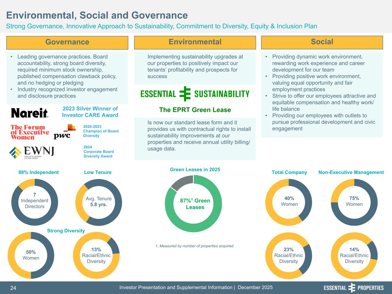 Investor Presentation and Supplemental Information | December 202524 254, 192, 59 75, 108, 127 146, 204, 238 0, 0, 0 38, 169, 224 153, 223, 227 Governance • Leading governance practices, Board accountability, strong board diversity, required minimum stock ownership, published compensation clawback policy, and no hedging or pledging • Industry recognized investor engagement and disclosure practices Environmental, Social and Governance Strong Governance, Innovative Approach to Sustainability, Commitment to Diversity, Equity & Inclusion Plan Environmental Social Implementing sustainability upgrades at our properties to positively impact our tenants’ profitability and prospects for success • Providing dynamic work environment, rewarding work experience and career development for our team • Providing positive work environment, valuing equal opportunity and fair employment practices • Strive to offer our employees attractive and equitable compensation and healthy work/ life balance • Providing our employees with outlets to pursue professional development and civic engagement 23% Racial/Ethnic Diversity 40% Women 14% Racial/Ethnic Diversity 75% Women Total Company Non-Executive Management 87%1 Green Leases 1. Measured by number of properties acquired 2020-2023 Champion of Board Diversity Avg. Tenure 5.8 yrs. 7 Independent Directors 50% Women 13% Racial/Ethnic Diversity Green Leases in 202588% Independent Low Tenure Strong Diversity 2023 Silver Winner of Investor CARE Award Is now our standard lease form and it provides us with contractual rights to install sustainability improvements at our properties and receive annual utility billing/ usage data. The EPRT Green Lease 2024 Corporate Board Diversity Award