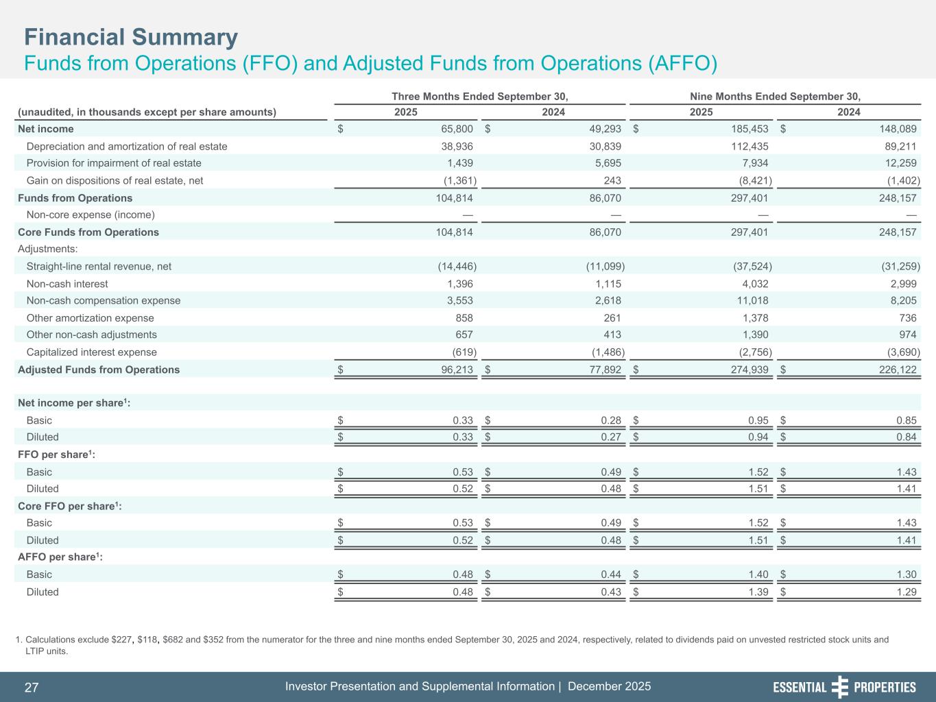 Investor Presentation and Supplemental Information | December 202527 254, 192, 59 75, 108, 127 146, 204, 238 0, 0, 0 38, 169, 224 153, 223, 227 1. Calculations exclude $227, $118, $682 and $352 from the numerator for the three and nine months ended September 30, 2025 and 2024, respectively, related to dividends paid on unvested restricted stock units and LTIP units. Financial Summary Funds from Operations (FFO) and Adjusted Funds from Operations (AFFO) 242, 242, 242 Three Months Ended September 30, Nine Months Ended September 30, (unaudited, in thousands except per share amounts) 2025 2024 2025 2024 Net income $ 65,800 $ 49,293 $ 185,453 $ 148,089 Depreciation and amortization of real estate 38,936 30,839 112,435 89,211 Provision for impairment of real estate 1,439 5,695 7,934 12,259 Gain on dispositions of real estate, net (1,361) 243 (8,421) (1,402) Funds from Operations 104,814 86,070 297,401 248,157 Non-core expense (income) — — — — Core Funds from Operations 104,814 86,070 297,401 248,157 Adjustments: Straight-line rental revenue, net (14,446) (11,099) (37,524) (31,259) Non-cash interest 1,396 1,115 4,032 2,999 Non-cash compensation expense 3,553 2,618 11,018 8,205 Other amortization expense 858 261 1,378 736 Other non-cash adjustments 657 413 1,390 974 Capitalized interest expense (619) (1,486) (2,756) (3,690) Adjusted Funds from Operations $ 96,213 $ 77,892 $ 274,939 $ 226,122 Net income per share1: Basic $ 0.33 $ 0.28 $ 0.95 $ 0.85 Diluted $ 0.33 $ 0.27 $ 0.94 $ 0.84 FFO per share1: Basic $ 0.53 $ 0.49 $ 1.52 $ 1.43 Diluted $ 0.52 $ 0.48 $ 1.51 $ 1.41 Core FFO per share1: Basic $ 0.53 $ 0.49 $ 1.52 $ 1.43 Diluted $ 0.52 $ 0.48 $ 1.51 $ 1.41 AFFO per share1: Basic $ 0.48 $ 0.44 $ 1.40 $ 1.30 Diluted $ 0.48 $ 0.43 $ 1.39 $ 1.29