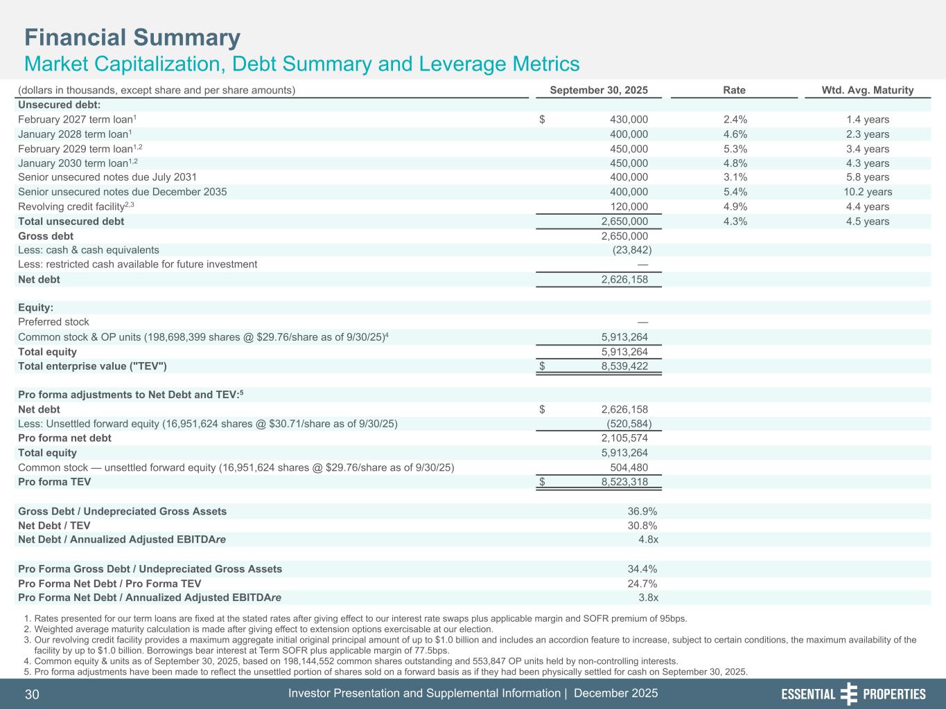 Investor Presentation and Supplemental Information | December 202530 254, 192, 59 75, 108, 127 146, 204, 238 0, 0, 0 38, 169, 224 153, 223, 227 1. Rates presented for our term loans are fixed at the stated rates after giving effect to our interest rate swaps plus applicable margin and SOFR premium of 95bps. 2. Weighted average maturity calculation is made after giving effect to extension options exercisable at our election. 3. Our revolving credit facility provides a maximum aggregate initial original principal amount of up to $1.0 billion and includes an accordion feature to increase, subject to certain conditions, the maximum availability of the facility by up to $1.0 billion. Borrowings bear interest at Term SOFR plus applicable margin of 77.5bps. 4. Common equity & units as of September 30, 2025, based on 198,144,552 common shares outstanding and 553,847 OP units held by non-controlling interests. 5. Pro forma adjustments have been made to reflect the unsettled portion of shares sold on a forward basis as if they had been physically settled for cash on September 30, 2025. Financial Summary Market Capitalization, Debt Summary and Leverage Metrics 242, 242, 242 (dollars in thousands, except share and per share amounts) September 30, 2025 Rate Wtd. Avg. Maturity Unsecured debt: February 2027 term loan1 $ 430,000 2.4% 1.4 years January 2028 term loan1 400,000 4.6% 2.3 years February 2029 term loan1,2 450,000 5.3% 3.4 years January 2030 term loan1,2 450,000 4.8% 4.3 years Senior unsecured notes due July 2031 400,000 3.1% 5.8 years Senior unsecured notes due December 2035 400,000 5.4% 10.2 years Revolving credit facility2,3 120,000 4.9% 4.4 years Total unsecured debt 2,650,000 4.3% 4.5 years Gross debt 2,650,000 Less: cash & cash equivalents (23,842) Less: restricted cash available for future investment — Net debt 2,626,158 Equity: Preferred stock — Common stock & OP units (198,698,399 shares @ $29.76/share as of 9/30/25)4 5,913,264 Total equity 5,913,264 Total enterprise value ("TEV") $ 8,539,422 Pro forma adjustments to Net Debt and TEV:5 Net debt $ 2,626,158 Less: Unsettled forward equity (16,951,624 shares @ $30.71/share as of 9/30/25) (520,584) Pro forma net debt 2,105,574 Total equity 5,913,264 Common stock — unsettled forward equity (16,951,624 shares @ $29.76/share as of 9/30/25) 504,480 Pro forma TEV $ 8,523,318 Gross Debt / Undepreciated Gross Assets 36.9% Net Debt / TEV 30.8% Net Debt / Annualized Adjusted EBITDAre 4.8x Pro Forma Gross Debt / Undepreciated Gross Assets 34.4% Pro Forma Net Debt / Pro Forma TEV 24.7% Pro Forma Net Debt / Annualized Adjusted EBITDAre 3.8x