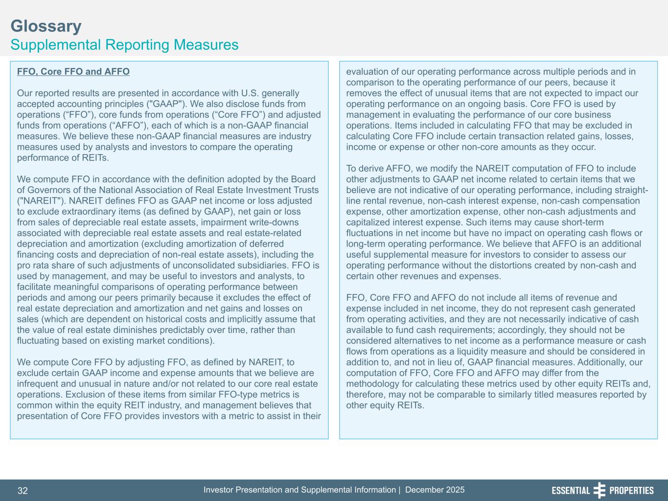 Investor Presentation and Supplemental Information | December 202532 254, 192, 59 75, 108, 127 146, 204, 238 0, 0, 0 38, 169, 224 153, 223, 227 Glossary Supplemental Reporting Measures 242, 242, 242 FFO, Core FFO and AFFO Our reported results are presented in accordance with U.S. generally accepted accounting principles ("GAAP"). We also disclose funds from operations (“FFO”), core funds from operations (“Core FFO”) and adjusted funds from operations (“AFFO”), each of which is a non-GAAP financial measures. We believe these non-GAAP financial measures are industry measures used by analysts and investors to compare the operating performance of REITs. We compute FFO in accordance with the definition adopted by the Board of Governors of the National Association of Real Estate Investment Trusts ("NAREIT"). NAREIT defines FFO as GAAP net income or loss adjusted to exclude extraordinary items (as defined by GAAP), net gain or loss from sales of depreciable real estate assets, impairment write-downs associated with depreciable real estate assets and real estate-related depreciation and amortization (excluding amortization of deferred financing costs and depreciation of non-real estate assets), including the pro rata share of such adjustments of unconsolidated subsidiaries. FFO is used by management, and may be useful to investors and analysts, to facilitate meaningful comparisons of operating performance between periods and among our peers primarily because it excludes the effect of real estate depreciation and amortization and net gains and losses on sales (which are dependent on historical costs and implicitly assume that the value of real estate diminishes predictably over time, rather than fluctuating based on existing market conditions). We compute Core FFO by adjusting FFO, as defined by NAREIT, to exclude certain GAAP income and expense amounts that we believe are infrequent and unusual in nature and/or not related to our core real estate operations. Exclusion of these items from similar FFO-type metrics is common within the equity REIT industry, and management believes that presentation of Core FFO provides investors with a metric to assist in their evaluation of our operating performance across multiple periods and in comparison to the operating performance of our peers, because it removes the effect of unusual items that are not expected to impact our operating performance on an ongoing basis. Core FFO is used by management in evaluating the performance of our core business operations. Items included in calculating FFO that may be excluded in calculating Core FFO include certain transaction related gains, losses, income or expense or other non-core amounts as they occur. To derive AFFO, we modify the NAREIT computation of FFO to include other adjustments to GAAP net income related to certain items that we believe are not indicative of our operating performance, including straight- line rental revenue, non-cash interest expense, non-cash compensation expense, other amortization expense, other non-cash adjustments and capitalized interest expense. Such items may cause short-term fluctuations in net income but have no impact on operating cash flows or long-term operating performance. We believe that AFFO is an additional useful supplemental measure for investors to consider to assess our operating performance without the distortions created by non-cash and certain other revenues and expenses. FFO, Core FFO and AFFO do not include all items of revenue and expense included in net income, they do not represent cash generated from operating activities, and they are not necessarily indicative of cash available to fund cash requirements; accordingly, they should not be considered alternatives to net income as a performance measure or cash flows from operations as a liquidity measure and should be considered in addition to, and not in lieu of, GAAP financial measures. Additionally, our computation of FFO, Core FFO and AFFO may differ from the methodology for calculating these metrics used by other equity REITs and, therefore, may not be comparable to similarly titled measures reported by other equity REITs.
