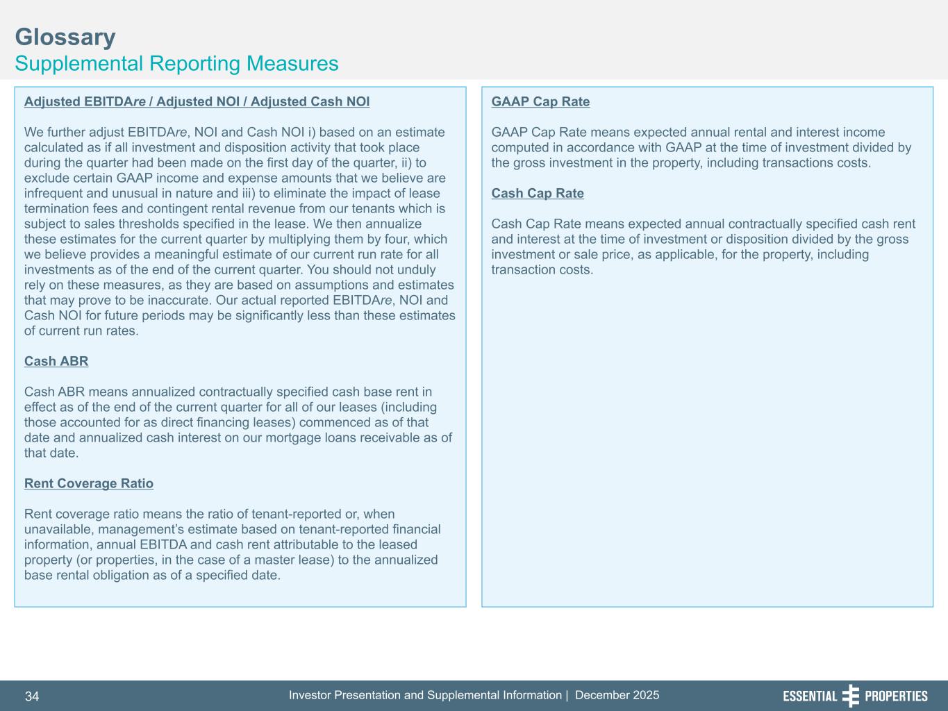 Investor Presentation and Supplemental Information | December 202534 254, 192, 59 75, 108, 127 146, 204, 238 0, 0, 0 38, 169, 224 153, 223, 227 Glossary Supplemental Reporting Measures 242, 242, 242 Adjusted EBITDAre / Adjusted NOI / Adjusted Cash NOI We further adjust EBITDAre, NOI and Cash NOI i) based on an estimate calculated as if all investment and disposition activity that took place during the quarter had been made on the first day of the quarter, ii) to exclude certain GAAP income and expense amounts that we believe are infrequent and unusual in nature and iii) to eliminate the impact of lease termination fees and contingent rental revenue from our tenants which is subject to sales thresholds specified in the lease. We then annualize these estimates for the current quarter by multiplying them by four, which we believe provides a meaningful estimate of our current run rate for all investments as of the end of the current quarter. You should not unduly rely on these measures, as they are based on assumptions and estimates that may prove to be inaccurate. Our actual reported EBITDAre, NOI and Cash NOI for future periods may be significantly less than these estimates of current run rates. Cash ABR Cash ABR means annualized contractually specified cash base rent in effect as of the end of the current quarter for all of our leases (including those accounted for as direct financing leases) commenced as of that date and annualized cash interest on our mortgage loans receivable as of that date. Rent Coverage Ratio Rent coverage ratio means the ratio of tenant-reported or, when unavailable, management’s estimate based on tenant-reported financial information, annual EBITDA and cash rent attributable to the leased property (or properties, in the case of a master lease) to the annualized base rental obligation as of a specified date. GAAP Cap Rate GAAP Cap Rate means expected annual rental and interest income computed in accordance with GAAP at the time of investment divided by the gross investment in the property, including transactions costs. Cash Cap Rate Cash Cap Rate means expected annual contractually specified cash rent and interest at the time of investment or disposition divided by the gross investment or sale price, as applicable, for the property, including transaction costs.