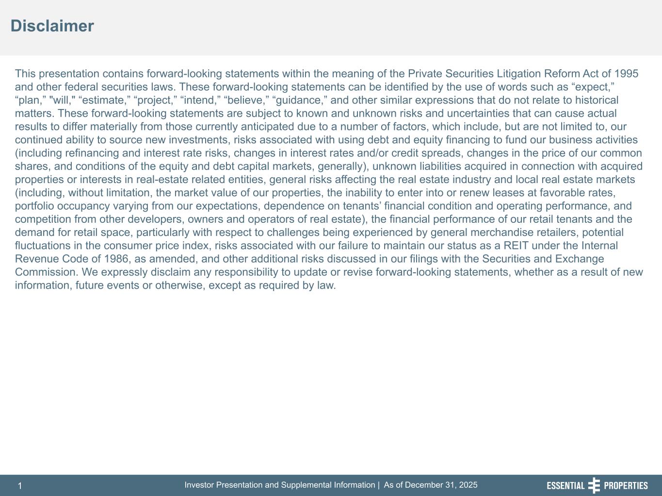 Investor Presentation and Supplemental Information | As of December 31, 20251 254, 192, 59 75, 108, 127 146, 204, 238 0, 0, 0 38, 169, 224 153, 223, 227 Disclaimer 242, 242, 242 This presentation contains forward-looking statements within the meaning of the Private Securities Litigation Reform Act of 1995 and other federal securities laws. These forward-looking statements can be identified by the use of words such as “expect,” “plan,” "will," “estimate,” “project,” “intend,” “believe,” “guidance,” and other similar expressions that do not relate to historical matters. These forward-looking statements are subject to known and unknown risks and uncertainties that can cause actual results to differ materially from those currently anticipated due to a number of factors, which include, but are not limited to, our continued ability to source new investments, risks associated with using debt and equity financing to fund our business activities (including refinancing and interest rate risks, changes in interest rates and/or credit spreads, changes in the price of our common shares, and conditions of the equity and debt capital markets, generally), unknown liabilities acquired in connection with acquired properties or interests in real-estate related entities, general risks affecting the real estate industry and local real estate markets (including, without limitation, the market value of our properties, the inability to enter into or renew leases at favorable rates, portfolio occupancy varying from our expectations, dependence on tenants’ financial condition and operating performance, and competition from other developers, owners and operators of real estate), the financial performance of our retail tenants and the demand for retail space, particularly with respect to challenges being experienced by general merchandise retailers, potential fluctuations in the consumer price index, risks associated with our failure to maintain our status as a REIT under the Internal Revenue Code of 1986, as amended, and other additional risks discussed in our filings with the Securities and Exchange Commission. We expressly disclaim any responsibility to update or revise forward-looking statements, whether as a result of new information, future events or otherwise, except as required by law.