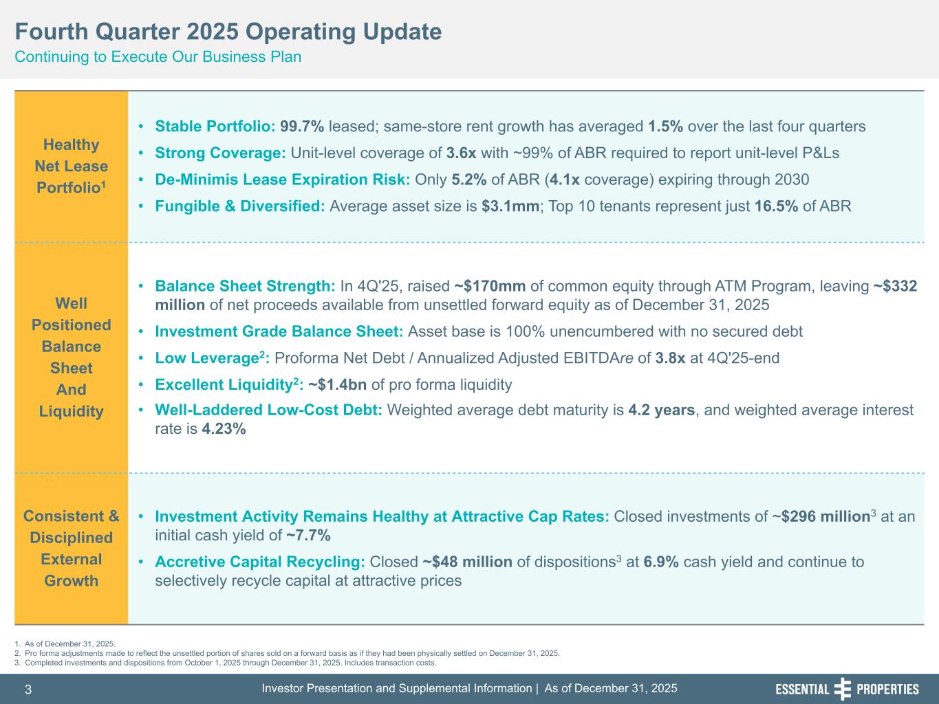 Investor Presentation and Supplemental Information | As of December 31, 20253 254, 192, 59 75, 108, 127 146, 204, 238 0, 0, 0 38, 169, 224 153, 223, 227 Healthy Net Lease Portfolio1 • Stable Portfolio: 99.7% leased; same-store rent growth has averaged 1.5% over the last four quarters • Strong Coverage: Unit-level coverage of 3.6x with ~99% of ABR required to report unit-level P&Ls • De-Minimis Lease Expiration Risk: Only 5.2% of ABR (4.1x coverage) expiring through 2030 • Fungible & Diversified: Average asset size is $3.1mm; Top 10 tenants represent just 16.5% of ABR Well Positioned Balance Sheet And Liquidity • Balance Sheet Strength: In 4Q'25, raised ~$170mm of common equity through ATM Program, leaving ~$332 million of net proceeds available from unsettled forward equity as of December 31, 2025 • Investment Grade Balance Sheet: Asset base is 100% unencumbered with no secured debt • Low Leverage2: Proforma Net Debt / Annualized Adjusted EBITDAre of 3.8x at 4Q'25-end • Excellent Liquidity2: ~$1.4bn of pro forma liquidity • Well-Laddered Low-Cost Debt: Weighted average debt maturity is 4.2 years, and weighted average interest rate is 4.23% Consistent & Disciplined External Growth • Investment Activity Remains Healthy at Attractive Cap Rates: Closed investments of ~$296 million3 at an initial cash yield of ~7.7% • Accretive Capital Recycling: Closed ~$48 million of dispositions3 at 6.9% cash yield and continue to selectively recycle capital at attractive prices 1. As of December 31, 2025. 2. Pro forma adjustments made to reflect the unsettled portion of shares sold on a forward basis as if they had been physically settled on December 31, 2025. 3. Completed investments and dispositions from October 1, 2025 through December 31, 2025. Includes transaction costs. Fourth Quarter 2025 Operating Update Continuing to Execute Our Business Plan